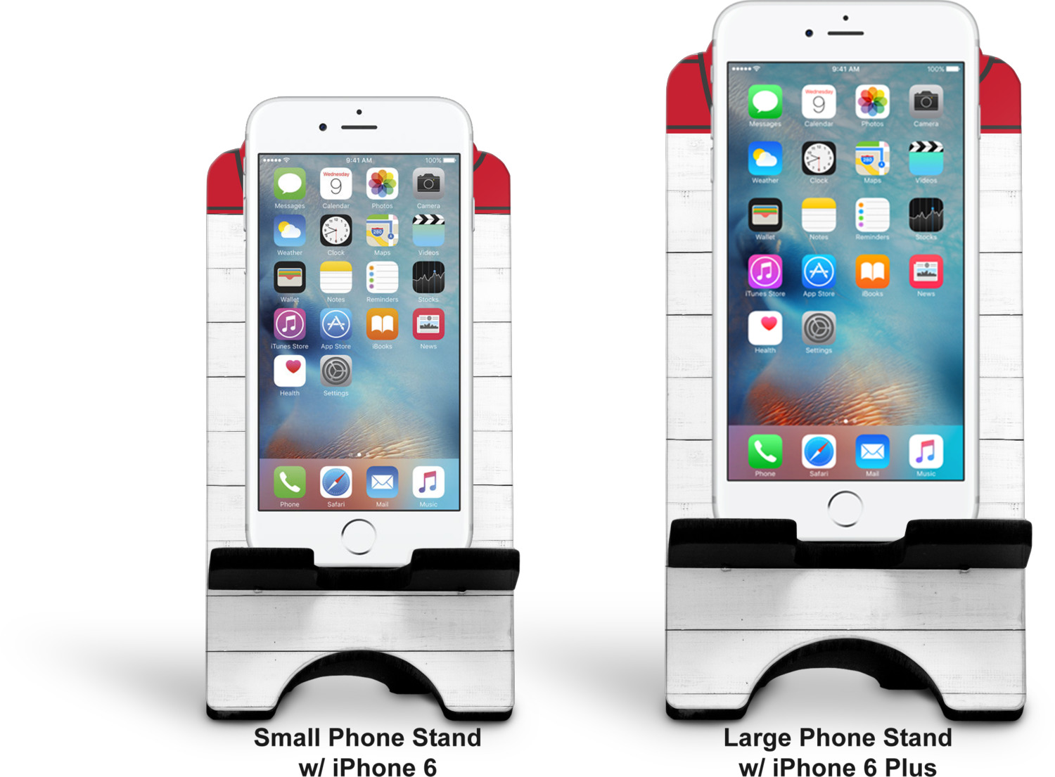 To meet your needs, we offer four variations of this IPhone stand. The backboard of the first version is shaped as a plain, yet sleek rectangle, and is available in two sizes. Our smaller size is approximately 4 by 3.25 by 7 inches, while the larger model is 4 by 3.77 by 8.5 inches. Alongside this model, we also provide you with a more decorative option. The upper part of our second version features a curved edge, for a classy, suave appearance. This phone holder is also sold in two sizes: a smaller version, which is 4 by 3.25 by 7 inches, and our larger model, which is 4 by 3.77 by 8.5 inches. Both models will support large phones, but the larger model is better if you wish to proudly display your personalized design.