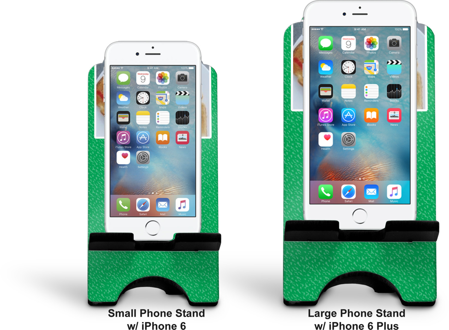To meet your needs, we offer four variations of this IPhone stand. The backboard of the first version is shaped as a plain, yet sleek rectangle, and is available in two sizes. Our smaller size is approximately 4 by 3.25 by 7 inches, while the larger model is 4 by 3.77 by 8.5 inches. Alongside this model, we also provide you with a more decorative option. The upper part of our second version features a curved edge, for a classy, suave appearance. This phone holder is also sold in two sizes: a smaller version, which is 4 by 3.25 by 7 inches, and our larger model, which is 4 by 3.77 by 8.5 inches. Both models will support large phones, but the larger model is better if you wish to proudly display your personalized design.