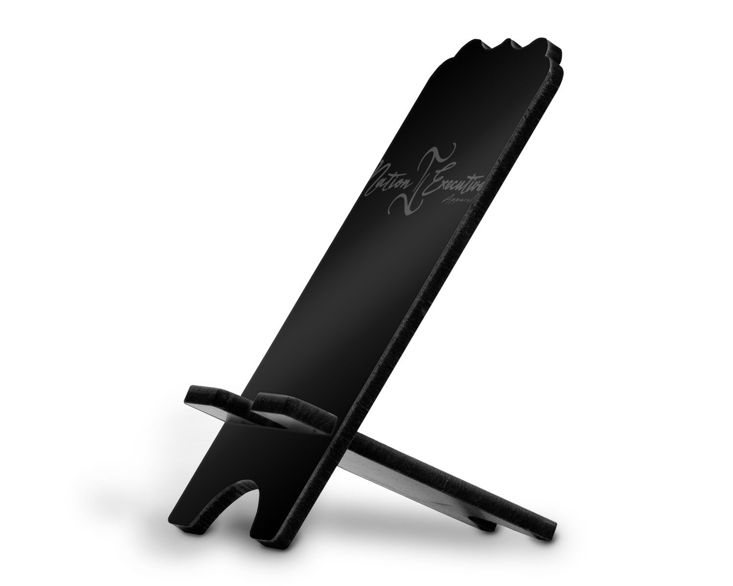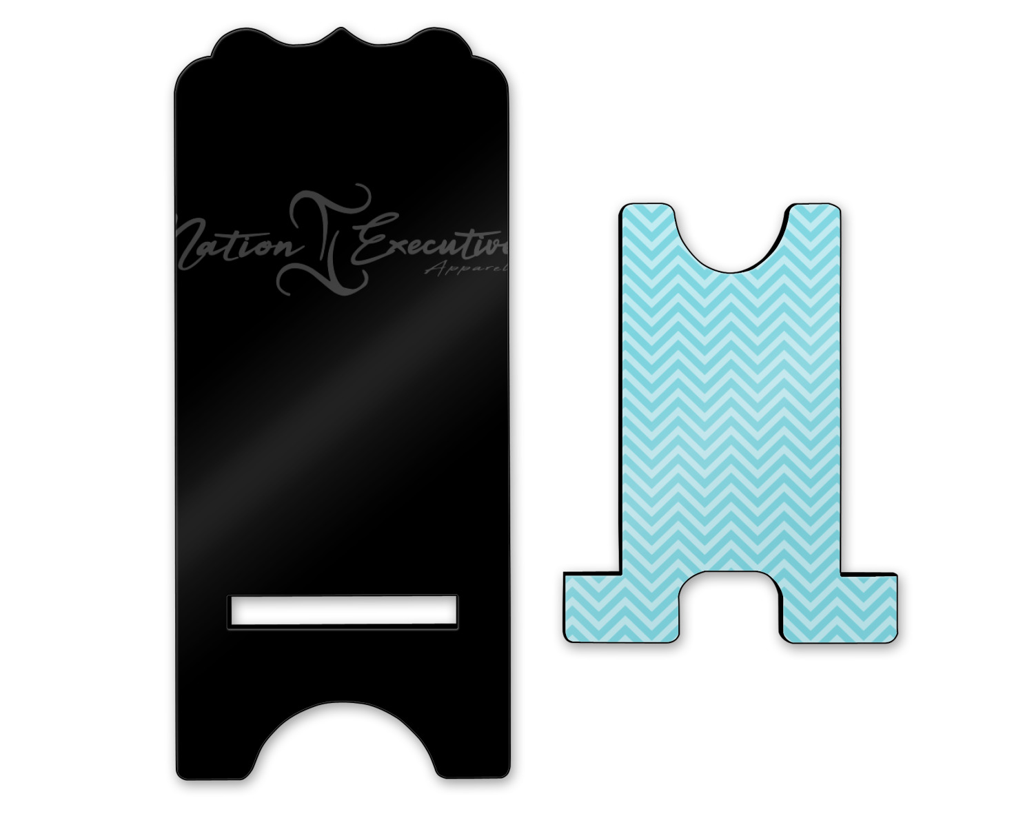 These cell phone holders are comprised of two hardboard pieces, that lock into and steady one another. The bottom part of the mobile phone stand is spacious enough to support both your phone and your charger, while it is not in use. We print your customization atop the face of this stand, while the remaining sides are a sophisticated, black color.