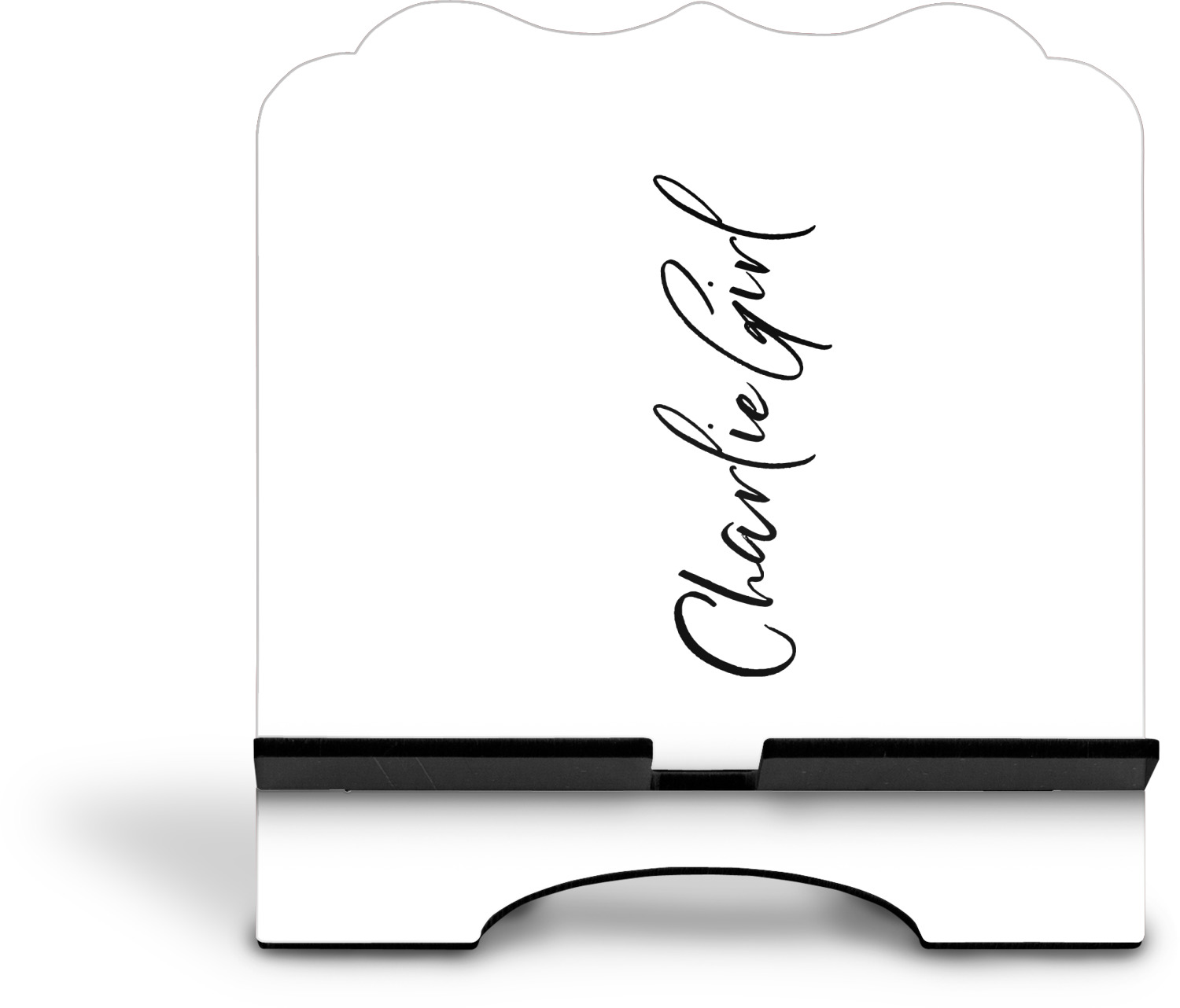 The stand is comprised of two hardboard pieces that fit snugly together and stabilize one another. The bottom part of the iPad stand supports your tablet, and has space for your tablets charger while in use. At 9.25" x 11.5", this tablet mount can support a device between the sizes of the iPad Pro and the iPad Mini 2. The uppermost part of the stand features a decorative, curved edge for a classy, suave appearance. We print your customization atop the face of the stand, in vibrant color. The remaining sides are colored a sleek black.