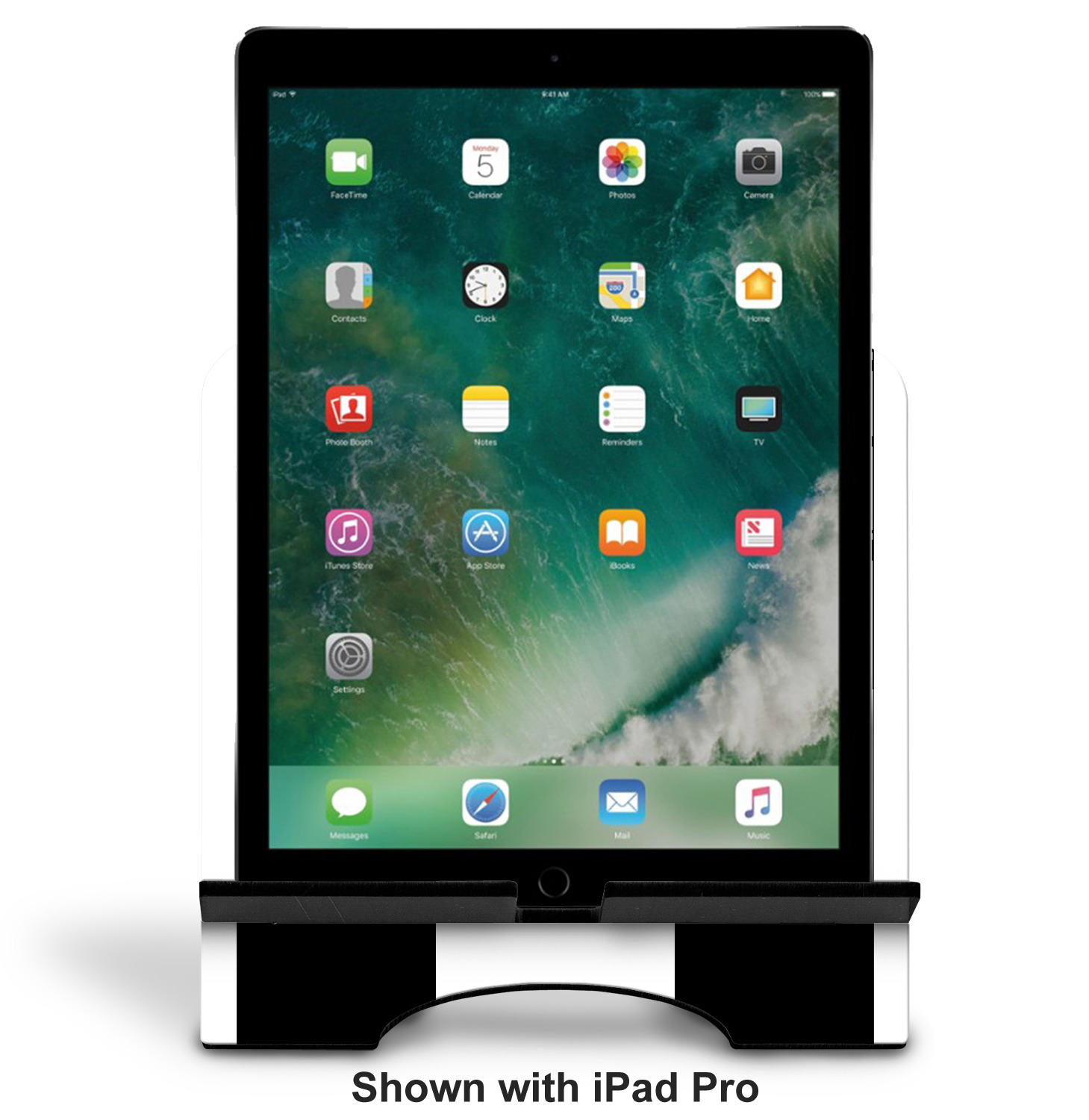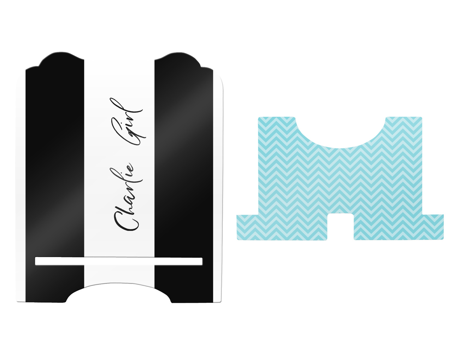 The stand is comprised of two hardboard pieces that fit snugly together and stabilize one another. The bottom part of the iPad stand supports your tablet, and has space for your tablets charger while in use. At 9.25" x 11.5", this tablet mount can support a device between the sizes of the iPad Pro and the iPad Mini 2. The uppermost part of the stand features a decorative, curved edge for a classy, suave appearance. We print your customization atop the face of the stand, in vibrant color. The remaining sides are colored a sleek black.
