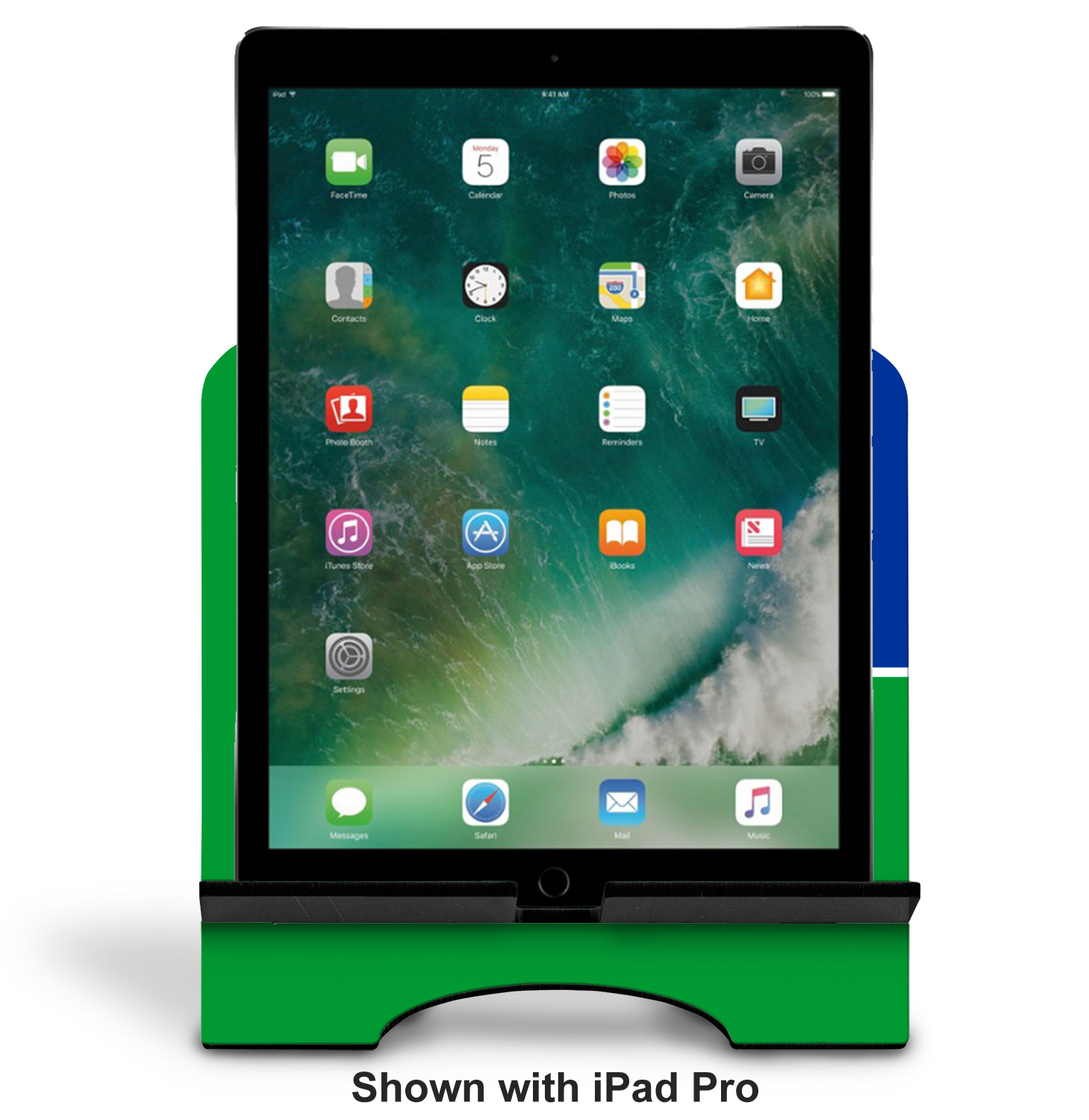 The stand is comprised of two hardboard pieces that fit snugly together and stabilize one another. The bottom part of the iPad stand supports your tablet, and has space for your tablets charger while in use. At 9.25" x 11.5", this tablet mount can support a device between the sizes of the iPad Pro and the iPad Mini 2. The uppermost part of the stand features a decorative, curved edge for a classy, suave appearance. We print your customization atop the face of the stand, in vibrant color. The remaining sides are colored a sleek black.