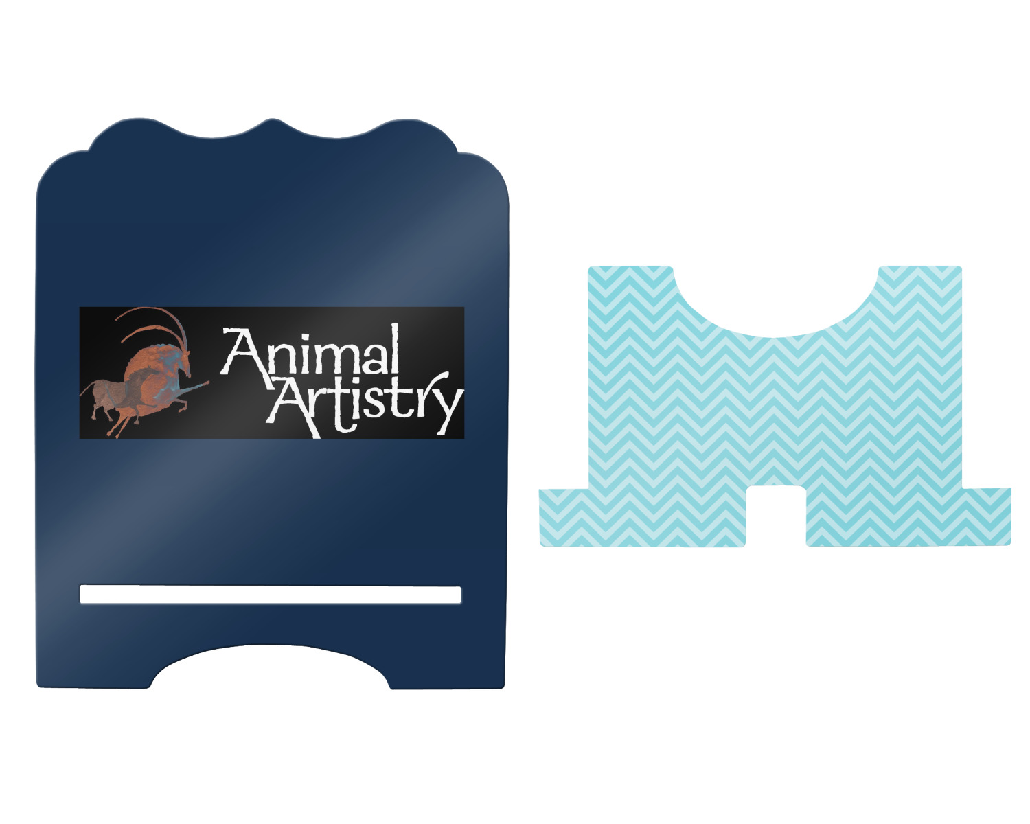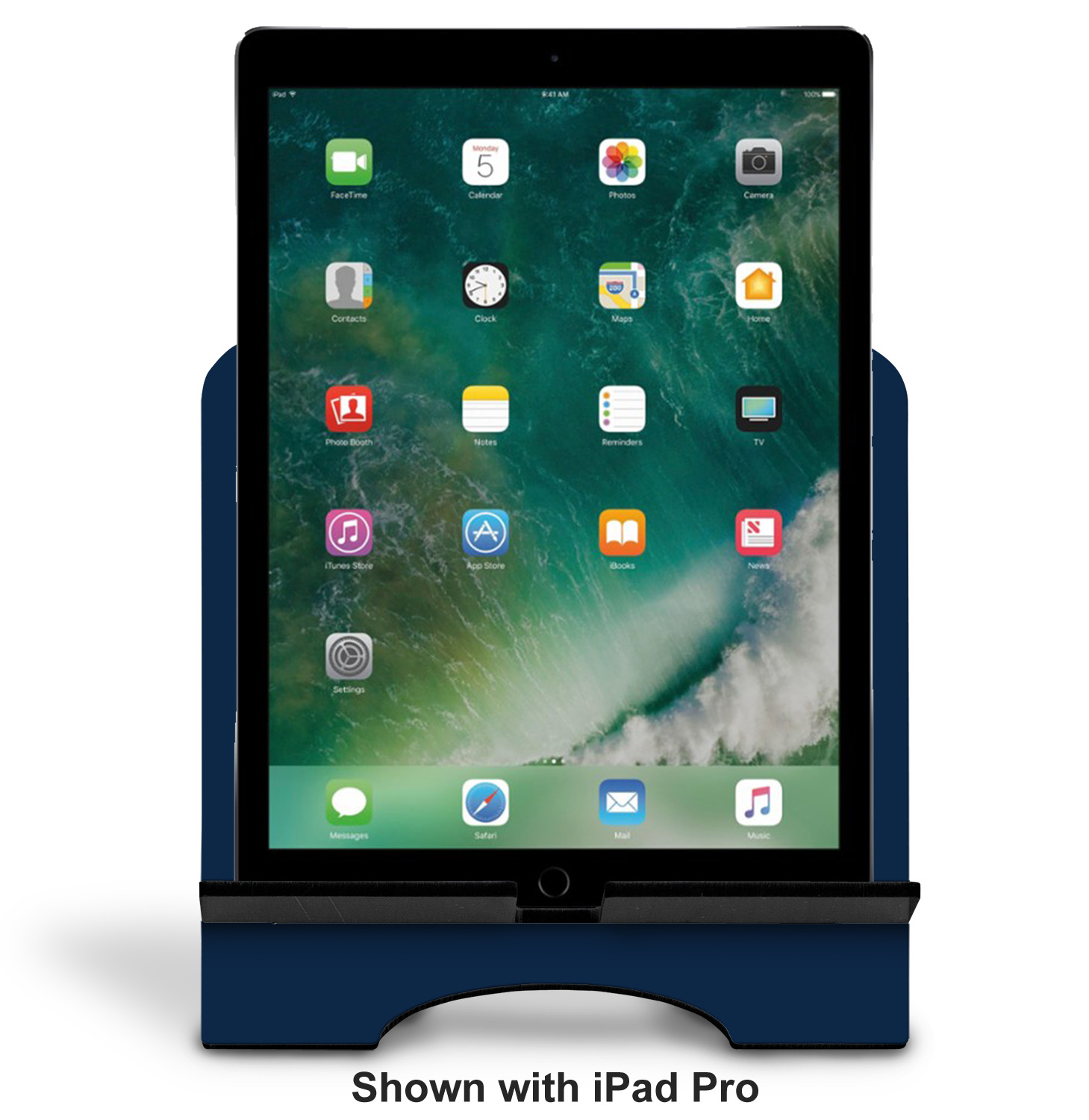 The stand is comprised of two hardboard pieces that fit snugly together and stabilize one another. The bottom part of the iPad stand supports your tablet, and has space for your tablets charger while in use. At 9.25" x 11.5", this tablet mount can support a device between the sizes of the iPad Pro and the iPad Mini 2. The uppermost part of the stand features a decorative, curved edge for a classy, suave appearance. We print your customization atop the face of the stand, in vibrant color. The remaining sides are colored a sleek black.
