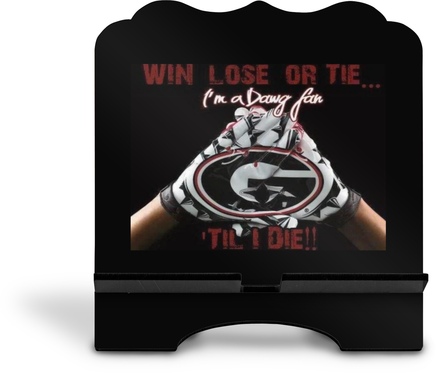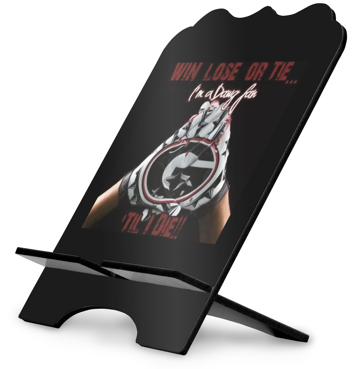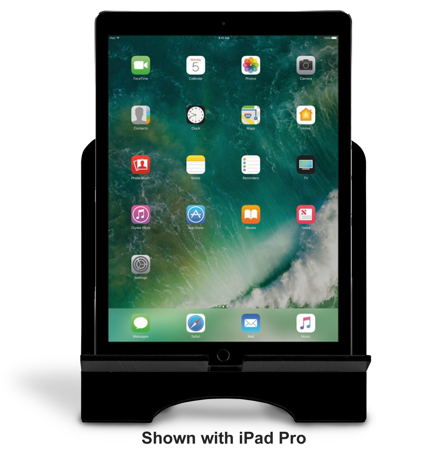 The stand is comprised of two hardboard pieces that fit snugly together and stabilize one another. The bottom part of the iPad stand supports your tablet, and has space for your tablets charger while in use. At 9.25" x 11.5", this tablet mount can support a device between the sizes of the iPad Pro and the iPad Mini 2. The uppermost part of the stand features a decorative, curved edge for a classy, suave appearance. We print your customization atop the face of the stand, in vibrant color. The remaining sides are colored a sleek black.
