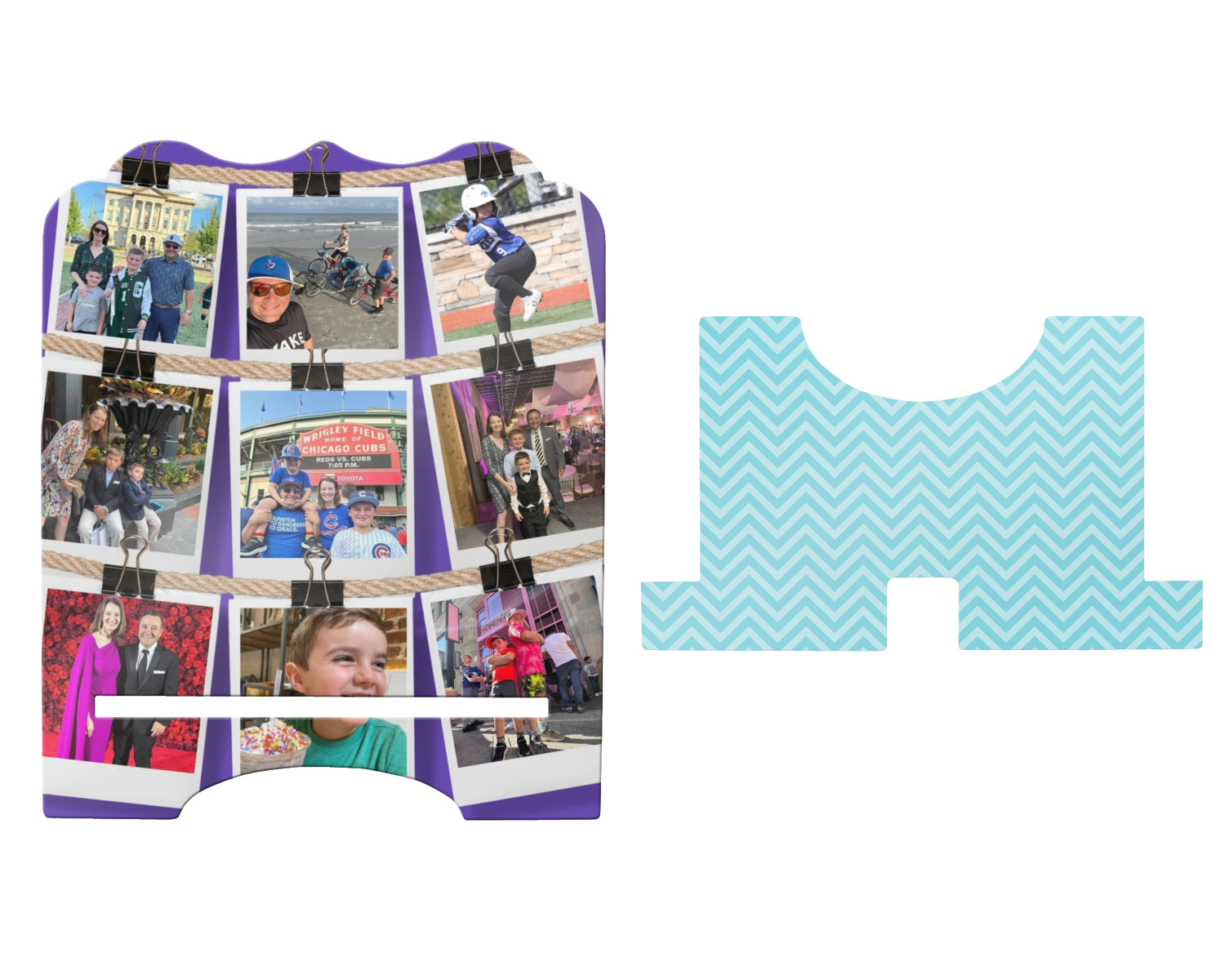 The stand is comprised of two hardboard pieces that fit snugly together and stabilize one another. The bottom part of the iPad stand supports your tablet, and has space for your tablets charger while in use. At 9.25" x 11.5", this tablet mount can support a device between the sizes of the iPad Pro and the iPad Mini 2. The uppermost part of the stand features a decorative, curved edge for a classy, suave appearance. We print your customization atop the face of the stand, in vibrant color. The remaining sides are colored a sleek black.