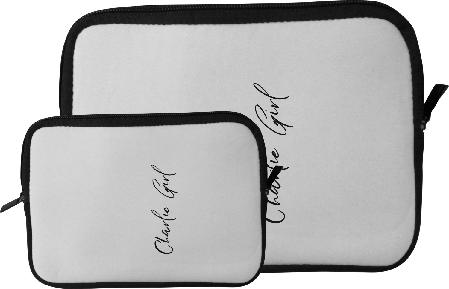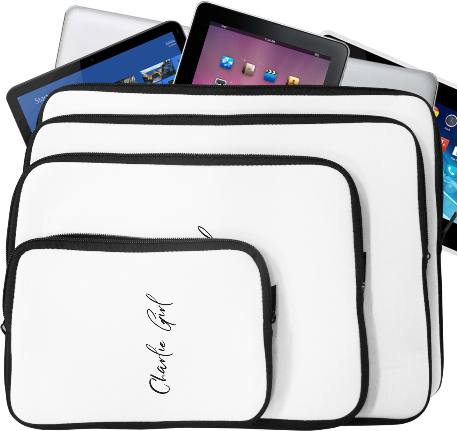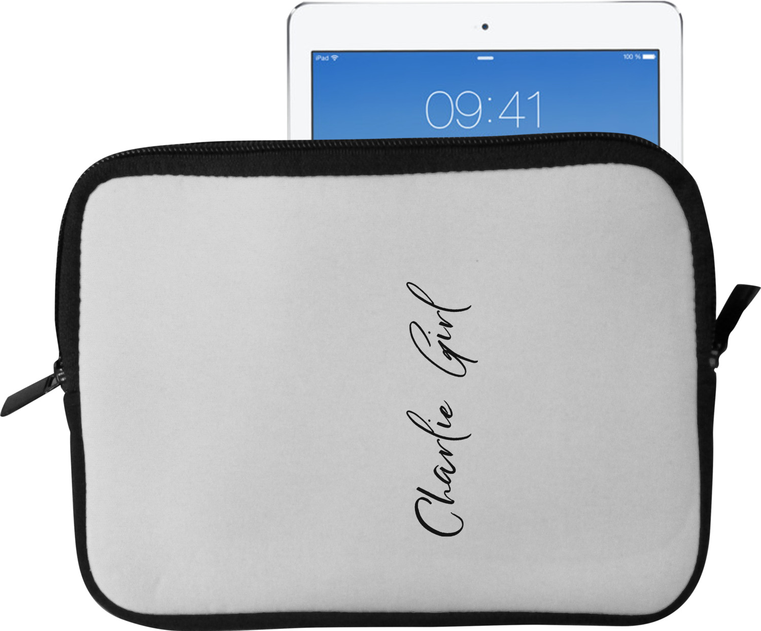 These tablet covers are fabricated from a water-resistant neoprene, and feature a zipper at its top for easy access to your device. The supple, cushioned nature of the neoprene will protect your tablet from the mishaps of daily life. Your personalized design is printed on the front of the I-Pad case, while the remaining sides are black in color. We provide this case in two sizes, in order to best accommodate your device. Our smaller size can fit a tablet with an 11 inch screen, while our larger sleeve is better suited for devices with approximately a 13 inch screen.