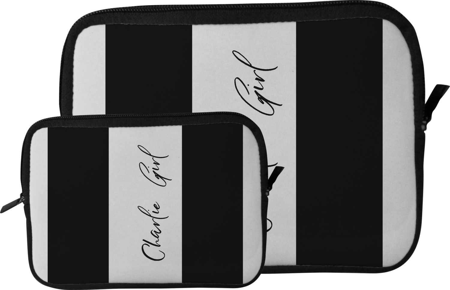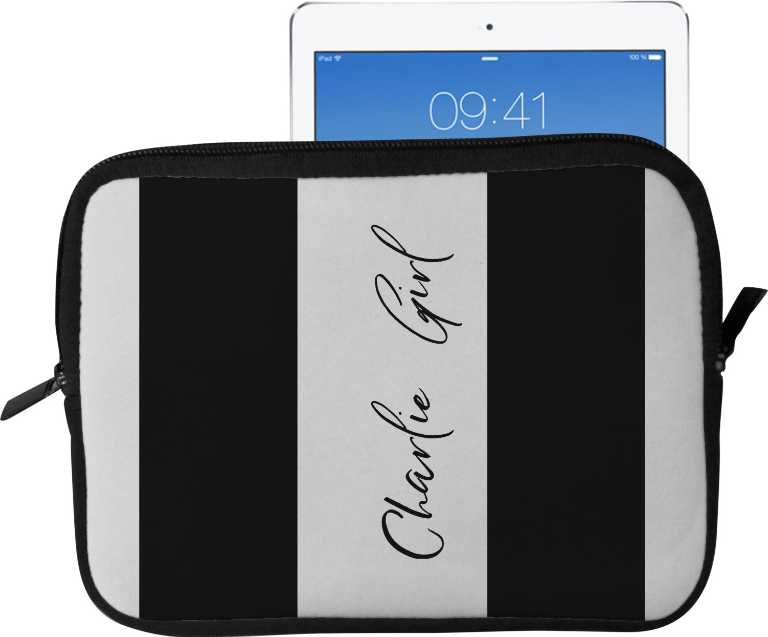 These tablet covers are fabricated from a water-resistant neoprene, and feature a zipper at its top for easy access to your device. The supple, cushioned nature of the neoprene will protect your tablet from the mishaps of daily life. Your personalized design is printed on the front of the I-Pad case, while the remaining sides are black in color. We provide this case in two sizes, in order to best accommodate your device. Our smaller size can fit a tablet with an 11 inch screen, while our larger sleeve is better suited for devices with approximately a 13 inch screen.