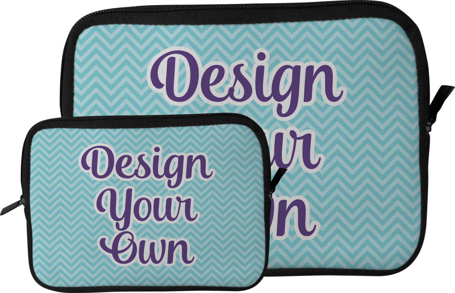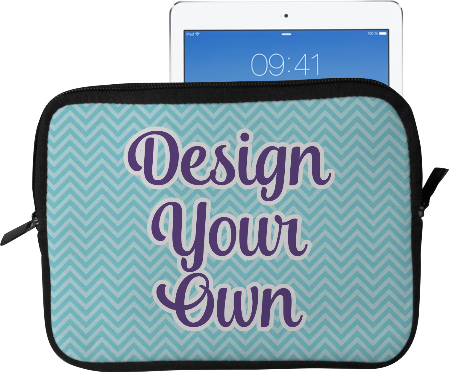 These tablet covers are fabricated from a water-resistant neoprene, and feature a zipper at its top for easy access to your device. The supple, cushioned nature of the neoprene will protect your tablet from the mishaps of daily life. Your personalized design is printed on the front of the I-Pad case, while the remaining sides are black in color. We provide this case in two sizes, in order to best accommodate your device. Our smaller size can fit a tablet with an 11 inch screen, while our larger sleeve is better suited for devices with approximately a 13 inch screen.
