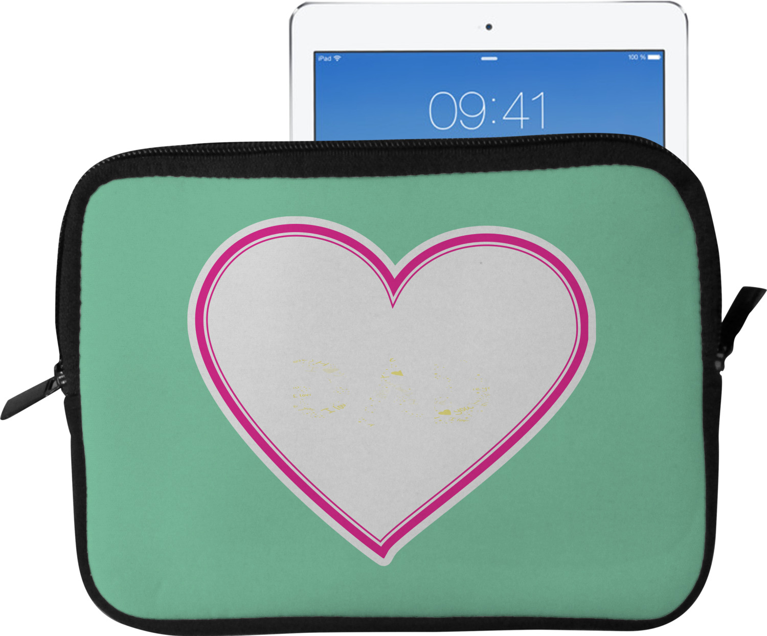 These tablet covers are fabricated from a water-resistant neoprene, and feature a zipper at its top for easy access to your device. The supple, cushioned nature of the neoprene will protect your tablet from the mishaps of daily life. Your personalized design is printed on the front of the I-Pad case, while the remaining sides are black in color. We provide this case in two sizes, in order to best accommodate your device. Our smaller size can fit a tablet with an 11 inch screen, while our larger sleeve is better suited for devices with approximately a 13 inch screen.