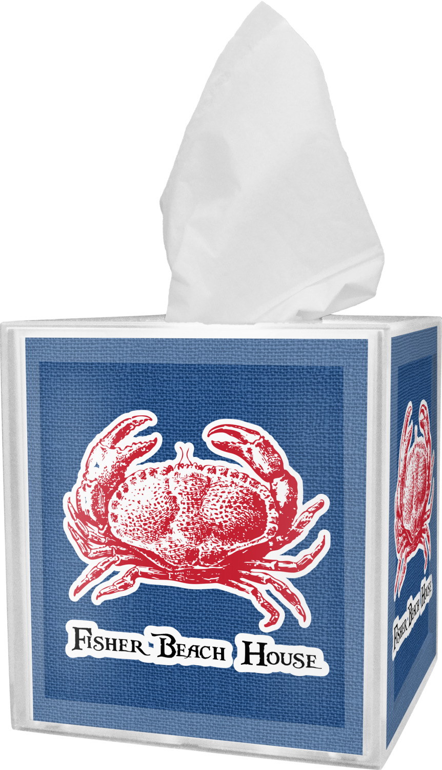 These tissue holders are built from durable acrylic and display your unique personalization on fine-quality vinyl inserts placed within the four sides and top. The box features two pieces, allowing you to easily switch out tissue boxes. On the sides, youll find ridges that ensure the top and base fit securely in place. The bottom of these tissue box holders has four, rubber, non-slip pads to prevent the box from scuffing any surface you decide to display it on. Each box can fit a standard 5 by 5-inch box of tissues.