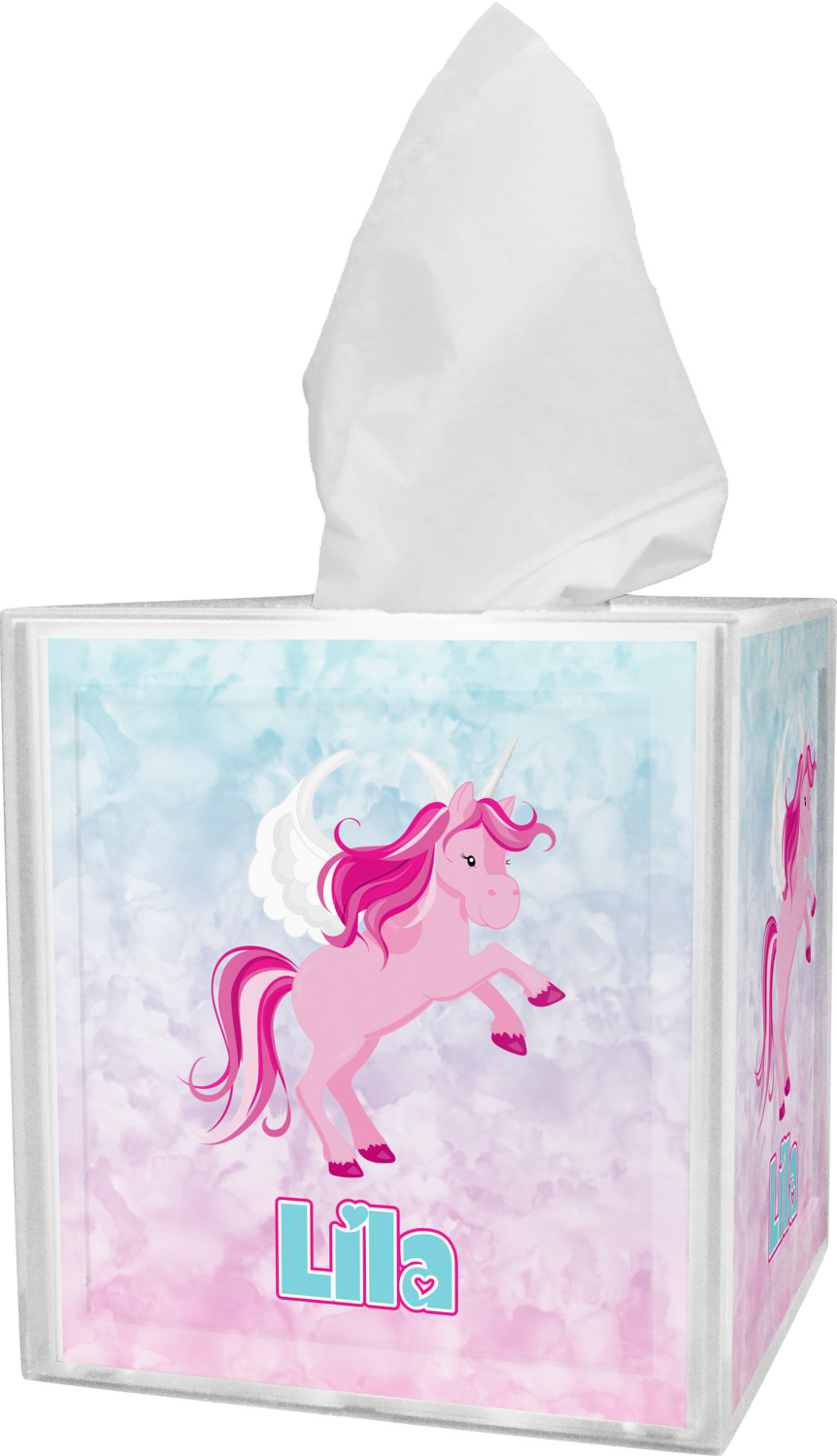 These tissue holders are built from durable acrylic and display your unique personalization on fine-quality vinyl inserts placed within the four sides and top. The box features two pieces, allowing you to easily switch out tissue boxes. On the sides, youll find ridges that ensure the top and base fit securely in place. The bottom of these tissue box holders has four, rubber, non-slip pads to prevent the box from scuffing any surface you decide to display it on. Each box can fit a standard 5 by 5-inch box of tissues.
