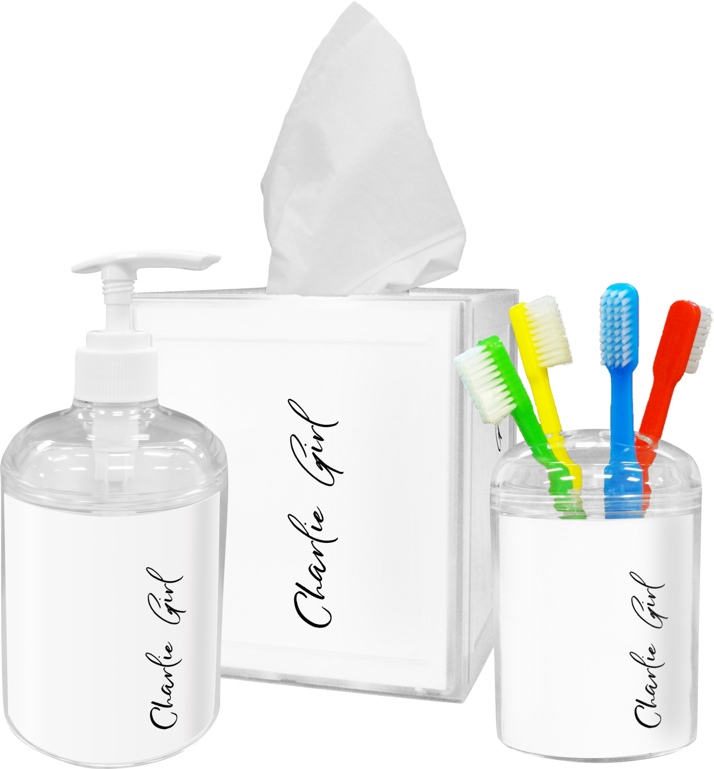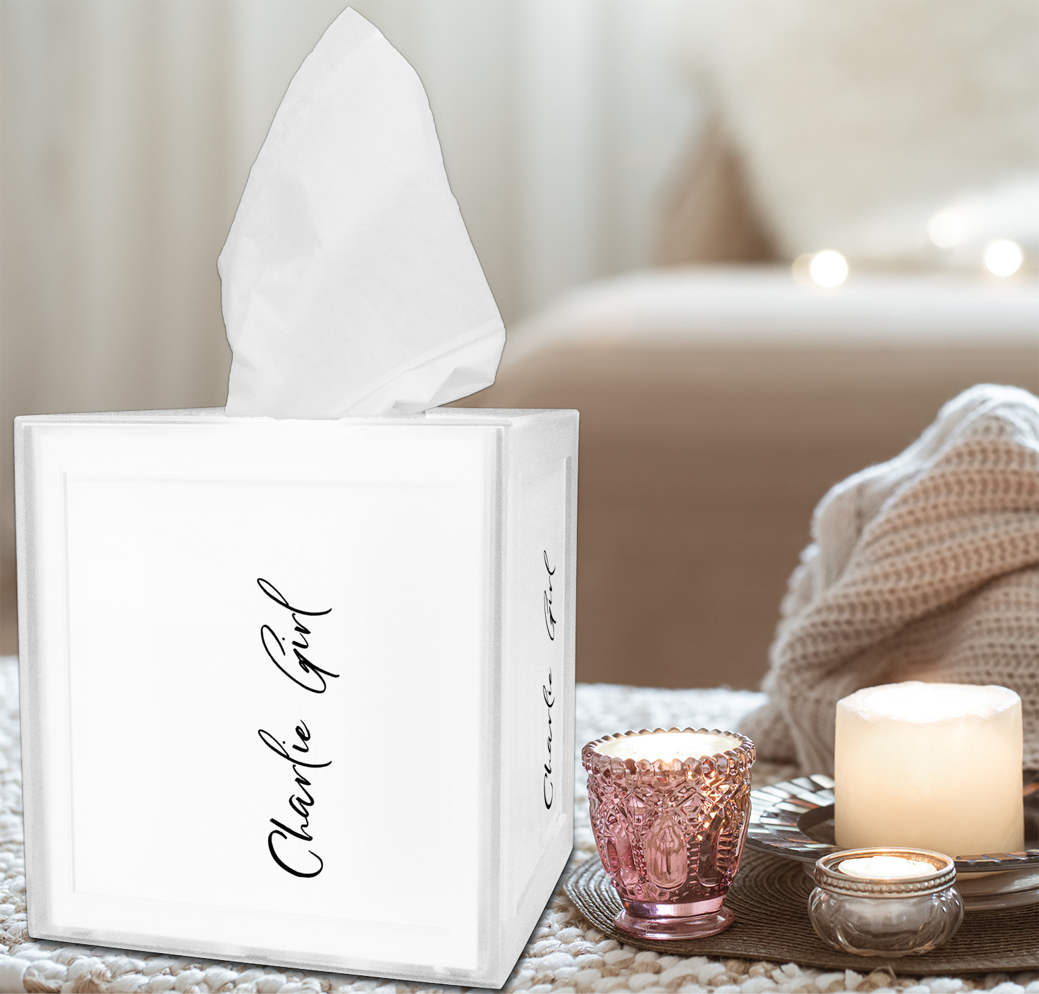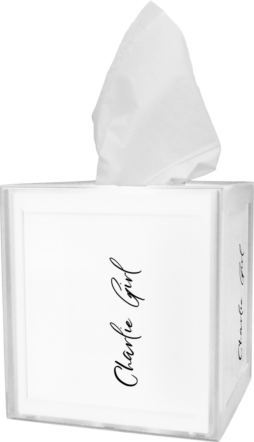 These tissue holders are built from durable acrylic and display your unique personalization on fine-quality vinyl inserts placed within the four sides and top. The box features two pieces, allowing you to easily switch out tissue boxes. On the sides, youll find ridges that ensure the top and base fit securely in place. The bottom of these tissue box holders has four, rubber, non-slip pads to prevent the box from scuffing any surface you decide to display it on. Each box can fit a standard 5 by 5-inch box of tissues.