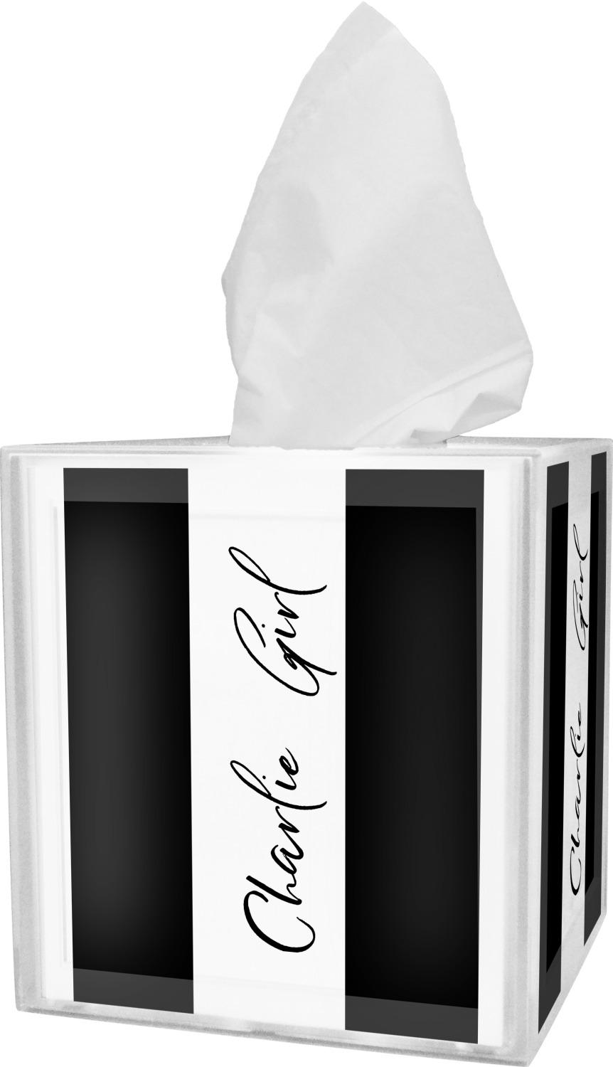 These tissue holders are built from durable acrylic and display your unique personalization on fine-quality vinyl inserts placed within the four sides and top. The box features two pieces, allowing you to easily switch out tissue boxes. On the sides, youll find ridges that ensure the top and base fit securely in place. The bottom of these tissue box holders has four, rubber, non-slip pads to prevent the box from scuffing any surface you decide to display it on. Each box can fit a standard 5 by 5-inch box of tissues.