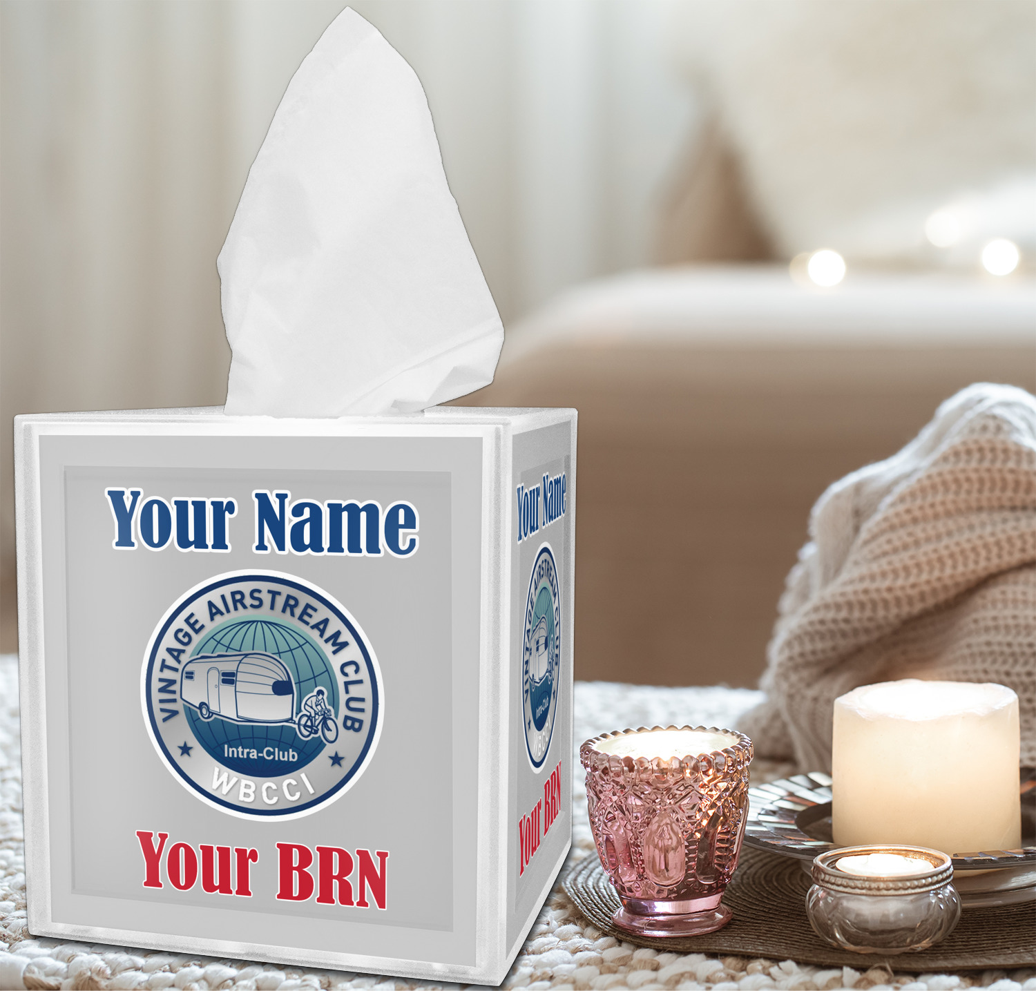 These tissue holders are built from durable acrylic and display your unique personalization on fine-quality vinyl inserts placed within the four sides and top. The box features two pieces, allowing you to easily switch out tissue boxes. On the sides, youll find ridges that ensure the top and base fit securely in place. The bottom of these tissue box holders has four, rubber, non-slip pads to prevent the box from scuffing any surface you decide to display it on. Each box can fit a standard 5 by 5-inch box of tissues.