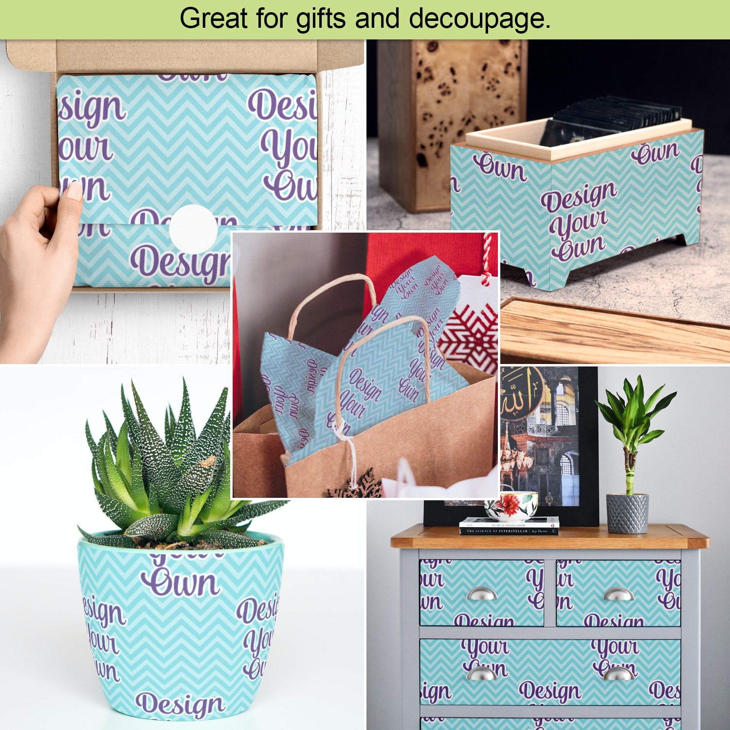 With our tissue paper sheets, you can now print whatever you want to decoupage. You don't have to figure out how to get text on top of purchased papers. You can design it all into a sheet(s) and decorate items exactly the way you want to.