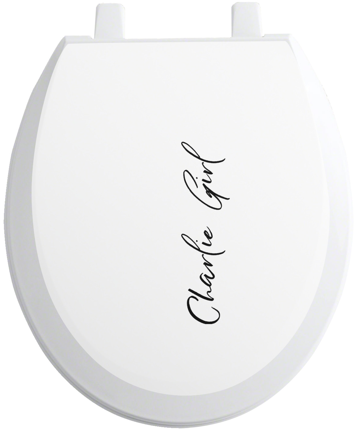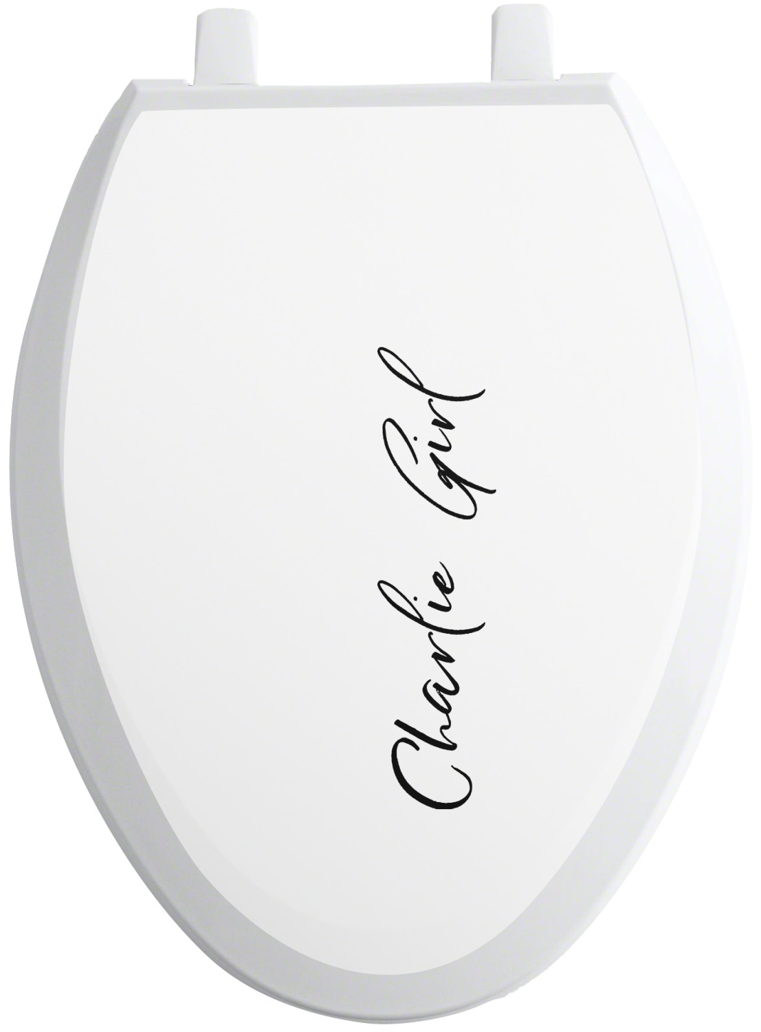 We sell these toilet lid decals in two different shapes to accommodate a wider range of toilet seat shapes. The first shape is our standard, round size, which measures at 13.5 by 12 inches. Our second option is an elongated shape, suited for long toilet seat covers. It measures 15 by 12 inches.