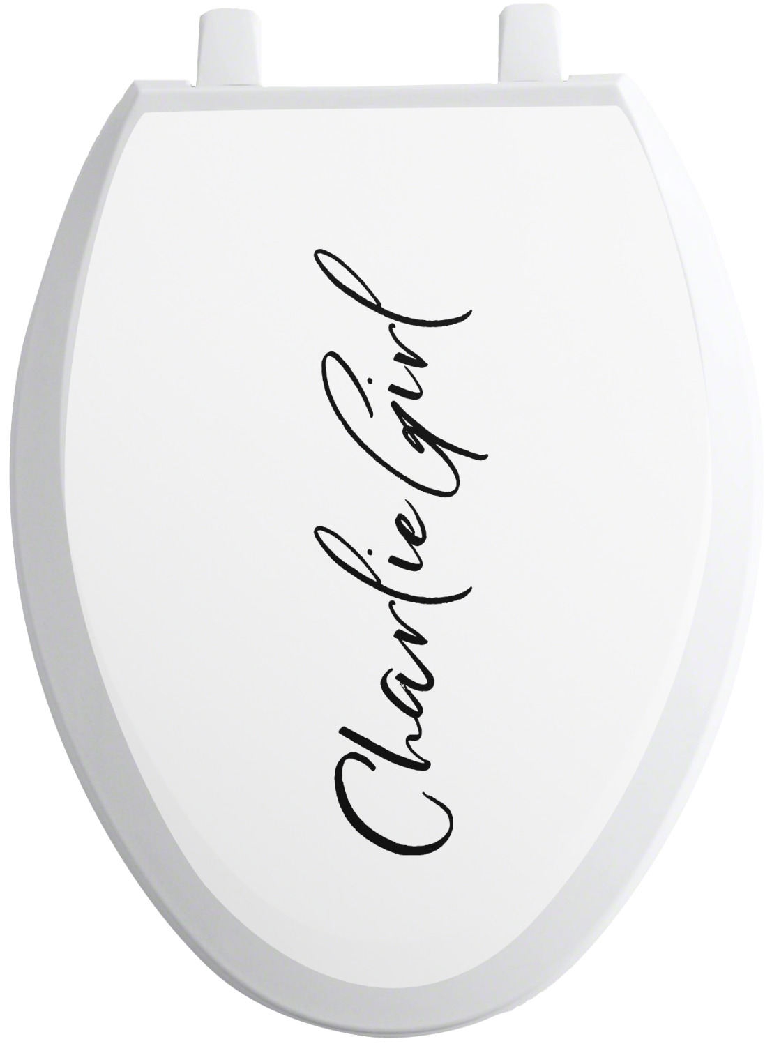 We sell these toilet lid decals in two different shapes to accommodate a wider range of toilet seat shapes. The first shape is our standard, round size, which measures at 13.5 by 12 inches. Our second option is an elongated shape, suited for long toilet seat covers. It measures 15 by 12 inches.