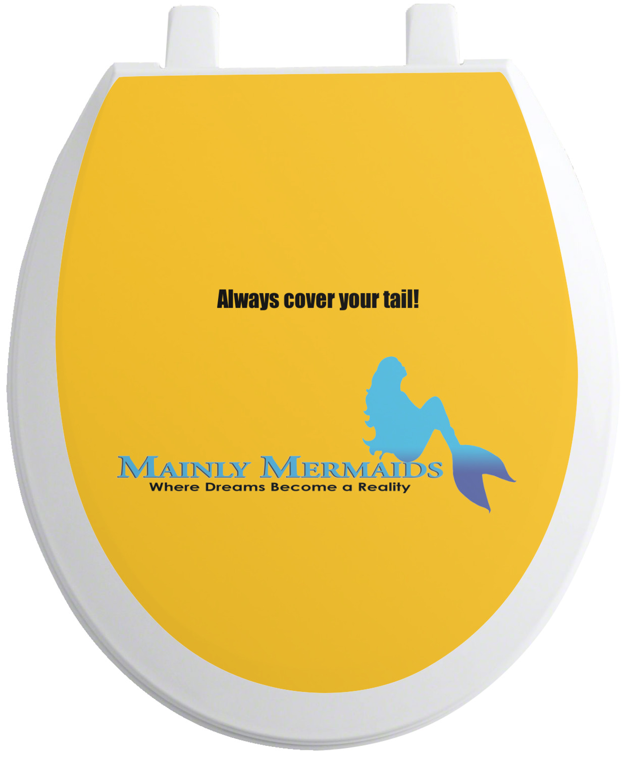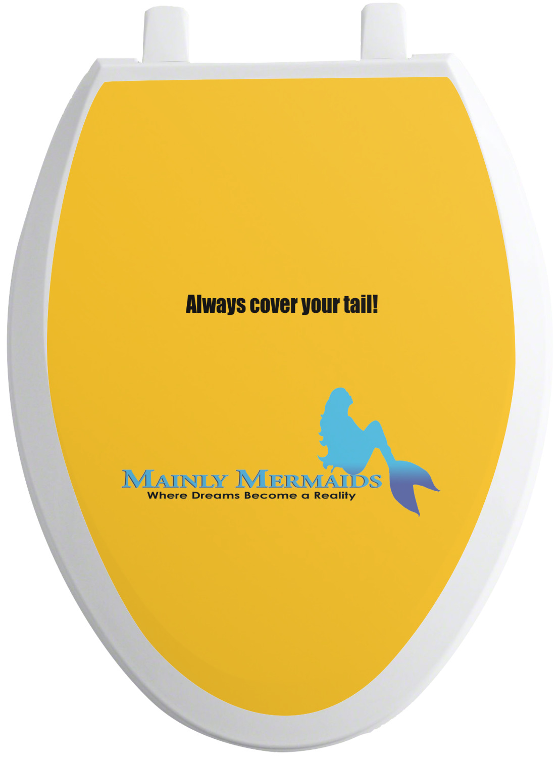 We sell these toilet lid decals in two different shapes to accommodate a wider range of toilet seat shapes. The first shape is our standard, round size, which measures at 13.5 by 12 inches. Our second option is an elongated shape, suited for long toilet seat covers. It measures 15 by 12 inches.