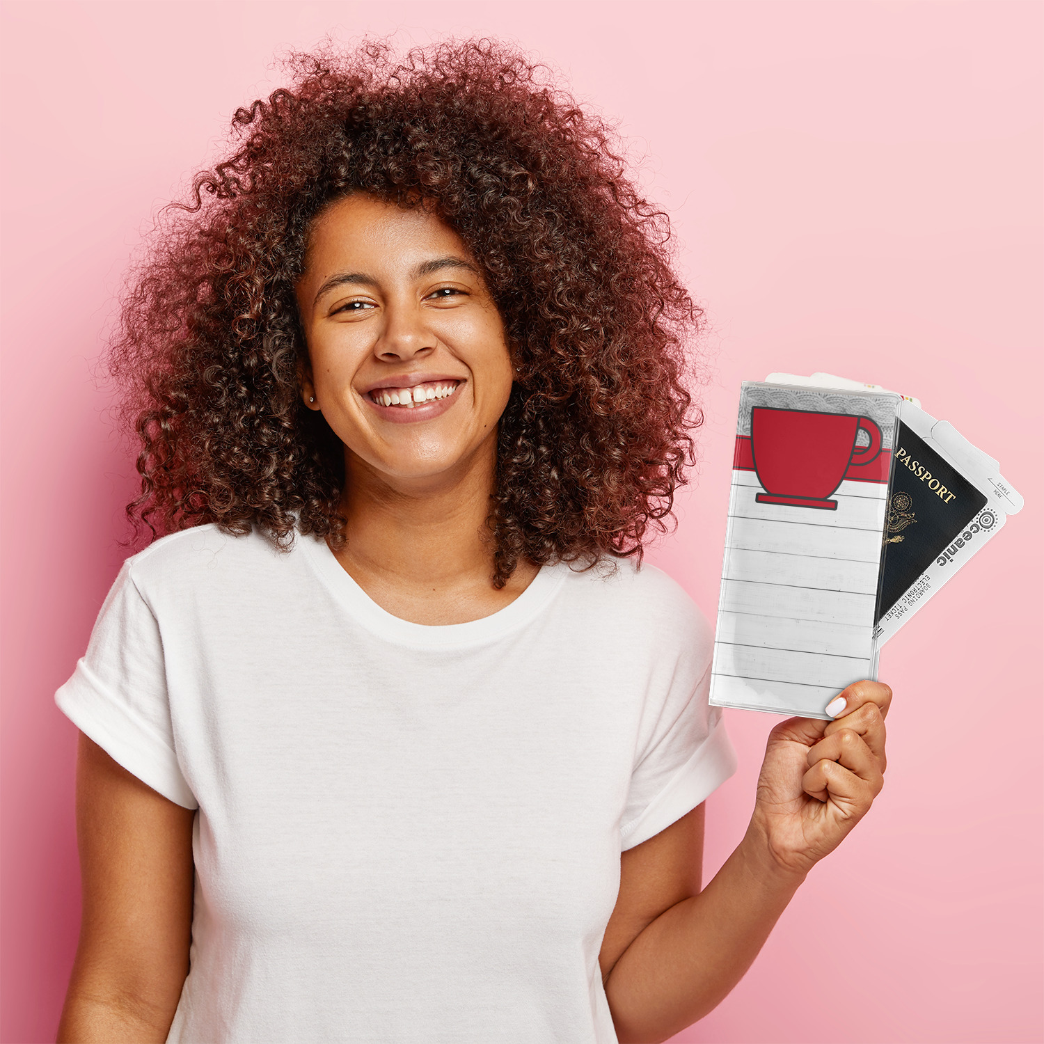 This document holder is really sturdy and has your personalized design inserted right behind all of your nifty pockets, so you can see it on the front and back covers. There are two large pockets and two shorter pockets inside. The larger pockets are tall enough to keep your boarding pass nice and straight. The smaller pockets (on top of the large pockets) are large enough to fit your passport, credit card, or ID.