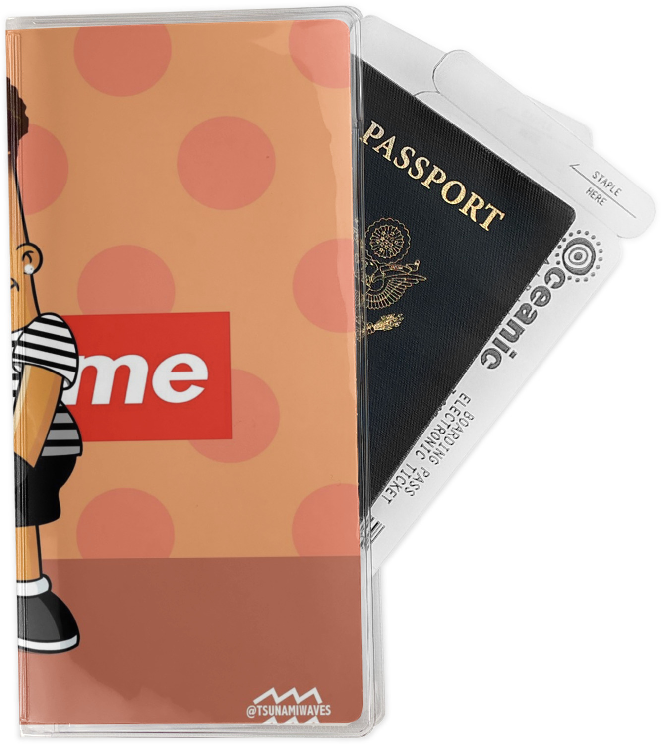 This document holder is really sturdy and has your personalized design inserted right behind all of your nifty pockets, so you can see it on the front and back covers. There are two large pockets and two shorter pockets inside. The larger pockets are tall enough to keep your boarding pass nice and straight. The smaller pockets (on top of the large pockets) are large enough to fit your passport, credit card, or ID.