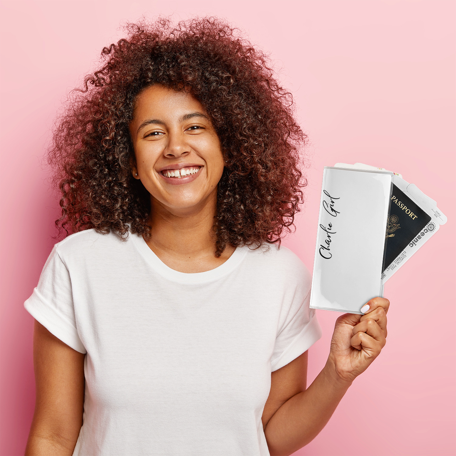 This document holder is really sturdy and has your personalized design inserted right behind all of your nifty pockets, so you can see it on the front and back covers. There are two large pockets and two shorter pockets inside. The larger pockets are tall enough to keep your boarding pass nice and straight. The smaller pockets (on top of the large pockets) are large enough to fit your passport, credit card, or ID.