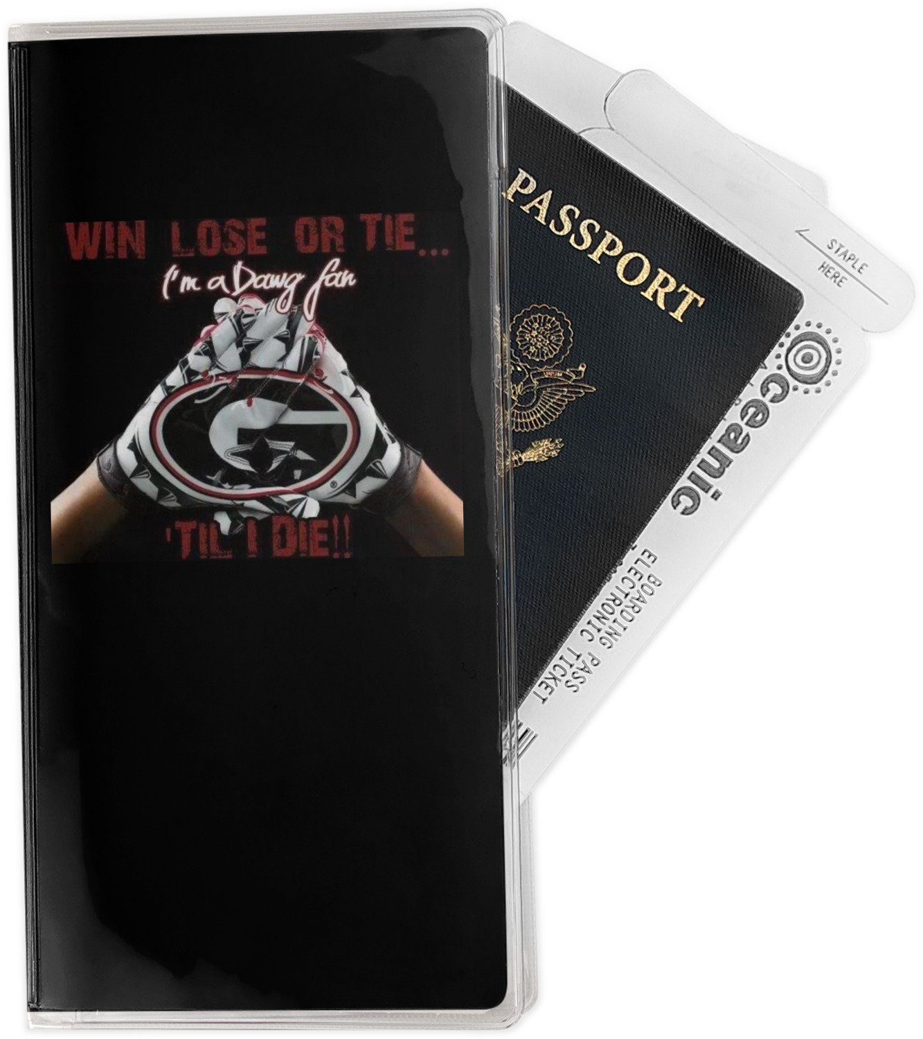This document holder is really sturdy and has your personalized design inserted right behind all of your nifty pockets, so you can see it on the front and back covers. There are two large pockets and two shorter pockets inside. The larger pockets are tall enough to keep your boarding pass nice and straight. The smaller pockets (on top of the large pockets) are large enough to fit your passport, credit card, or ID.
