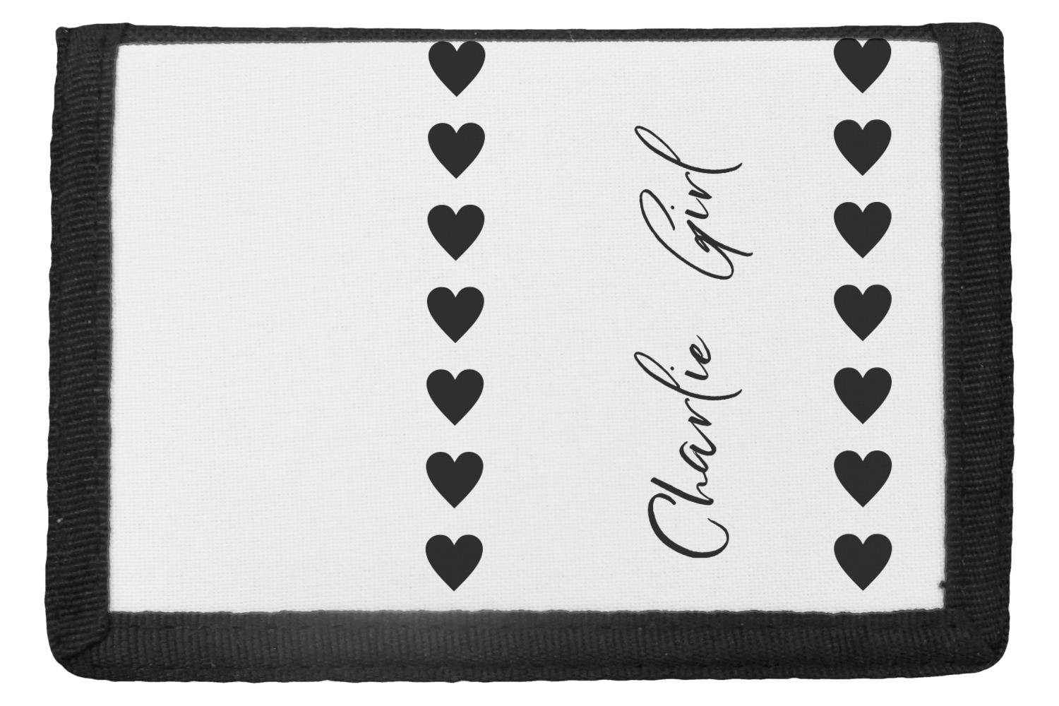 The wallets are black with the design printed on the front flap. You are able to create your design either horizontally OR vertically. They have 4 slots for IDs or credit cards and 1 large slot for cash. The wallet folds in thirds and is tightly secured by velcro. They are great starter wallets for kids or just as a good durable wallet for an adult.