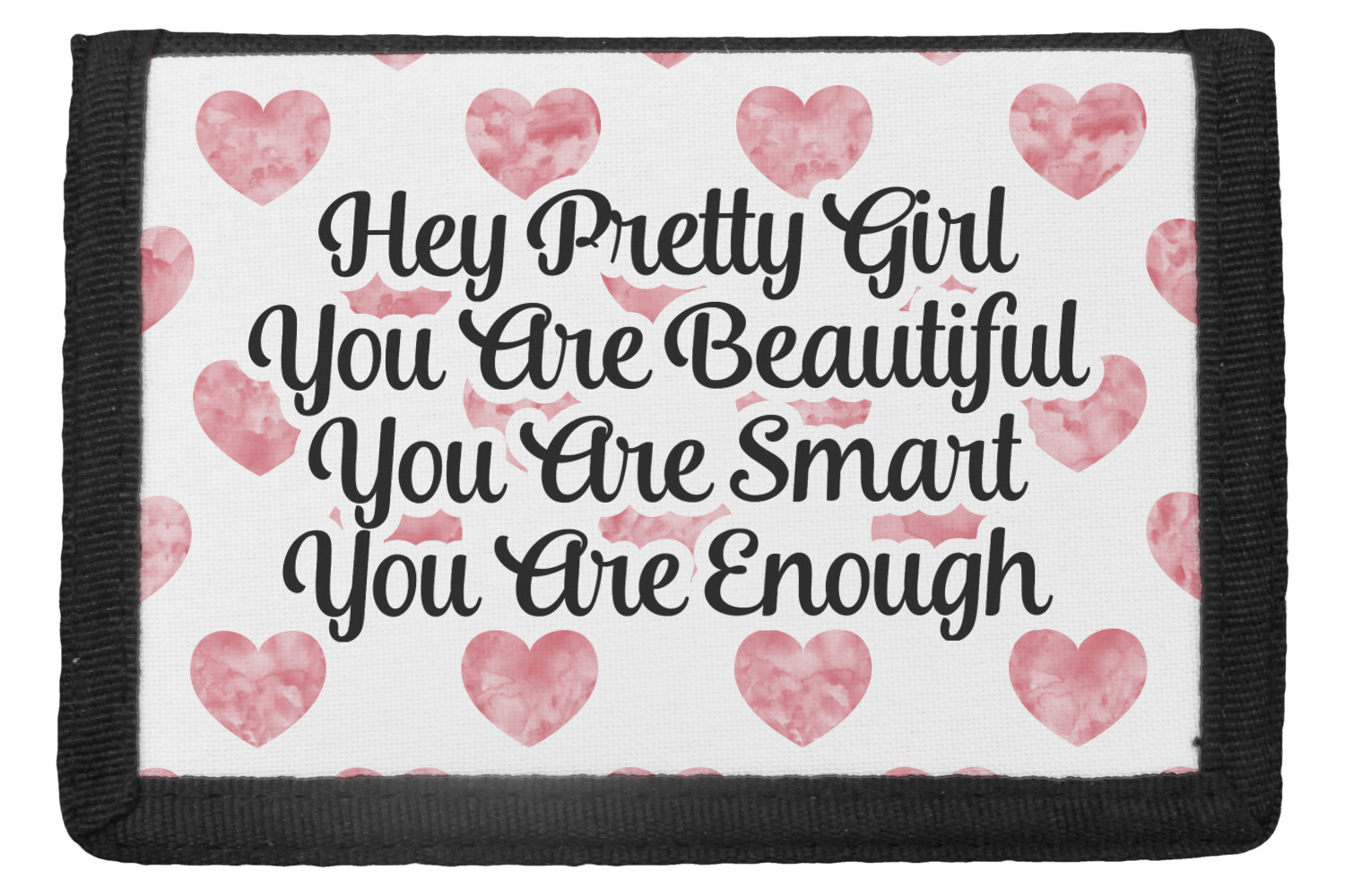 The wallets are black with the design printed on the front flap. You are able to create your design either horizontally OR vertically. They have 4 slots for IDs or credit cards and 1 large slot for cash. The wallet folds in thirds and is tightly secured by velcro. They are great starter wallets for kids or just as a good durable wallet for an adult.