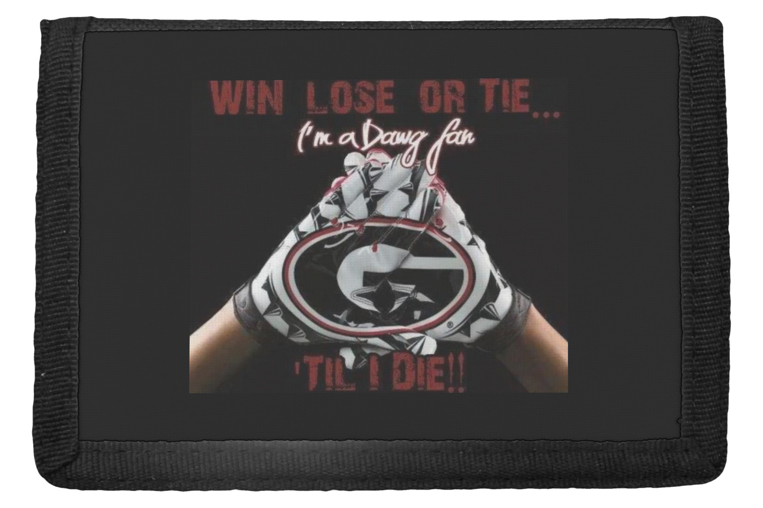 The wallets are black with the design printed on the front flap. You are able to create your design either horizontally OR vertically. They have 4 slots for IDs or credit cards and 1 large slot for cash. The wallet folds in thirds and is tightly secured by velcro. They are great starter wallets for kids or just as a good durable wallet for an adult.