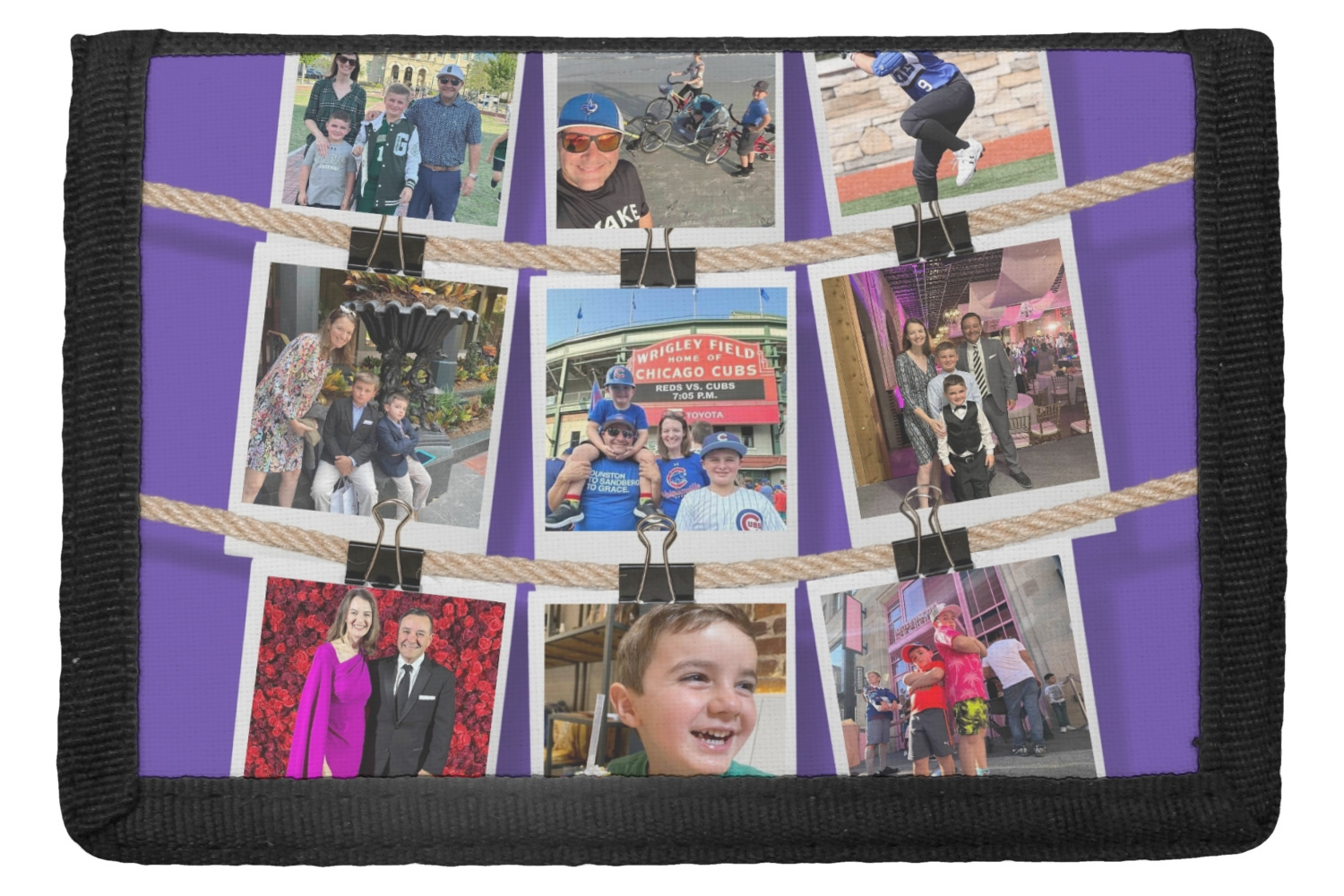 The wallets are black with the design printed on the front flap. You are able to create your design either horizontally OR vertically. They have 4 slots for IDs or credit cards and 1 large slot for cash. The wallet folds in thirds and is tightly secured by velcro. They are great starter wallets for kids or just as a good durable wallet for an adult.