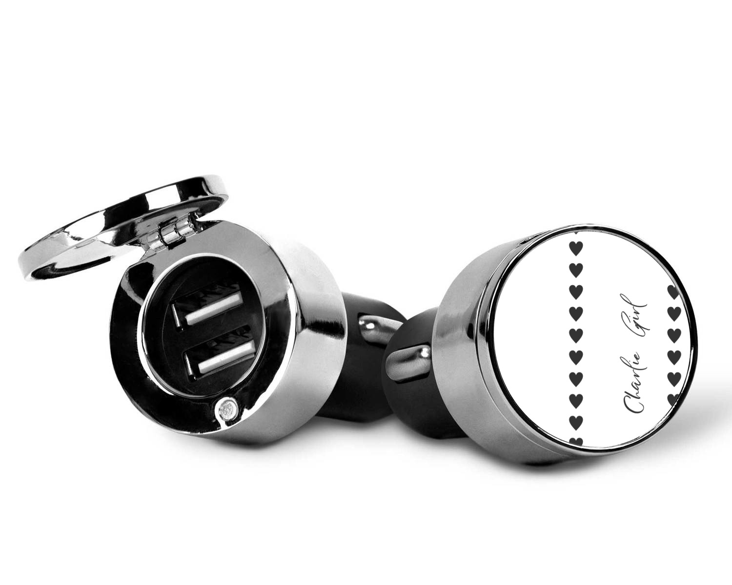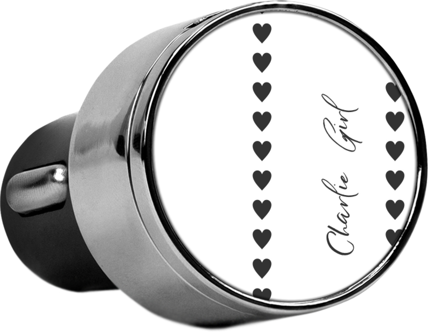 This car charger adapter converts your cars bland cigarette lighter into a decorative, personalized, and operational USB charging port. Made of solid, silver-plated metal, these chargers feature a flip-open lid that both displays your customized design and conceals two USB ports. The metal lid of the USB car charger adapter is 1.5" in diameter and seals due to a small, ingrained magnet on both the charger and its lid. The cigarette lighter insert, itself, is colored black.