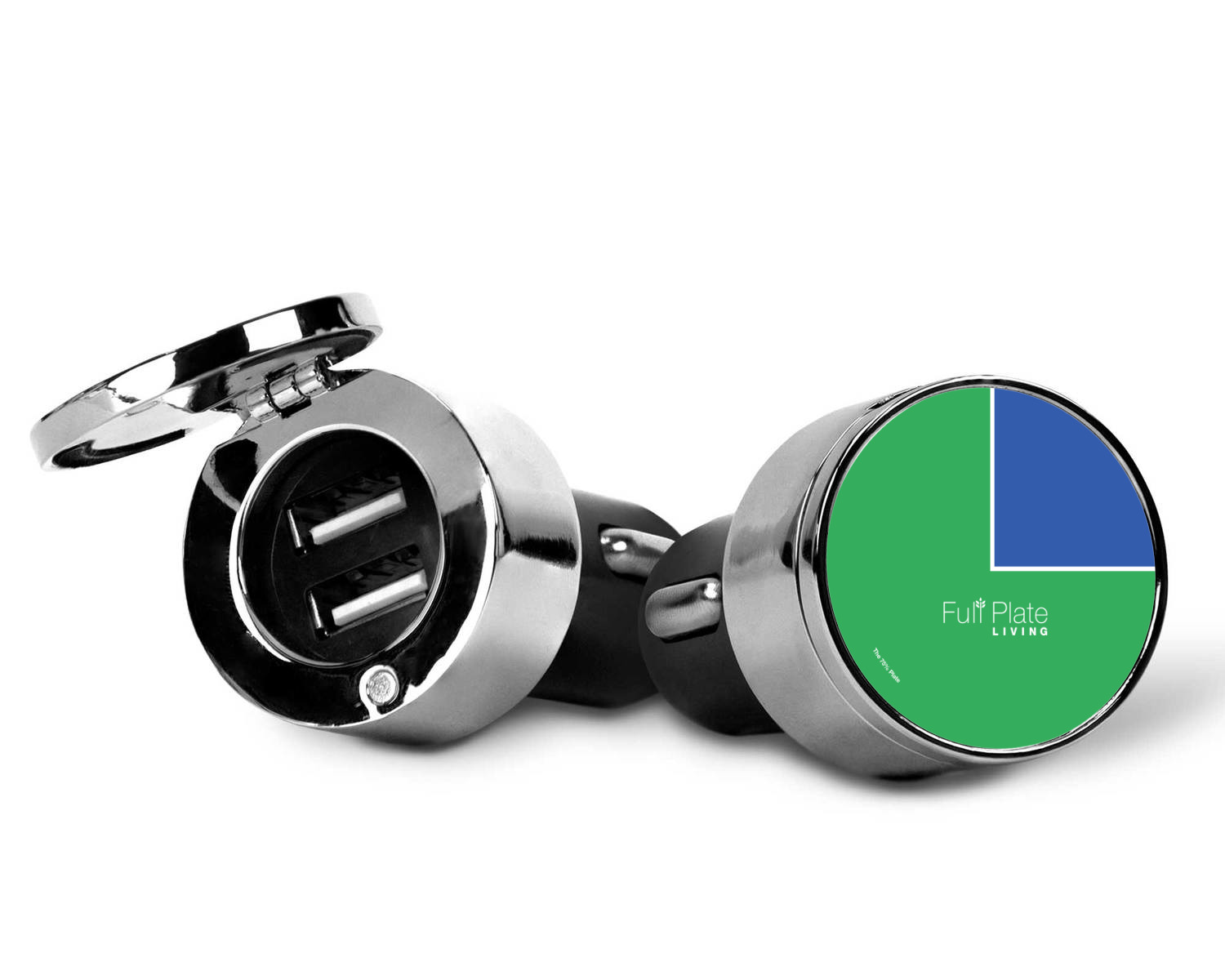 This car charger adapter converts your cars bland cigarette lighter into a decorative, personalized, and operational USB charging port. Made of solid, silver-plated metal, these chargers feature a flip-open lid that both displays your customized design and conceals two USB ports. The metal lid of the USB car charger adapter is 1.5" in diameter and seals due to a small, ingrained magnet on both the charger and its lid. The cigarette lighter insert, itself, is colored black.