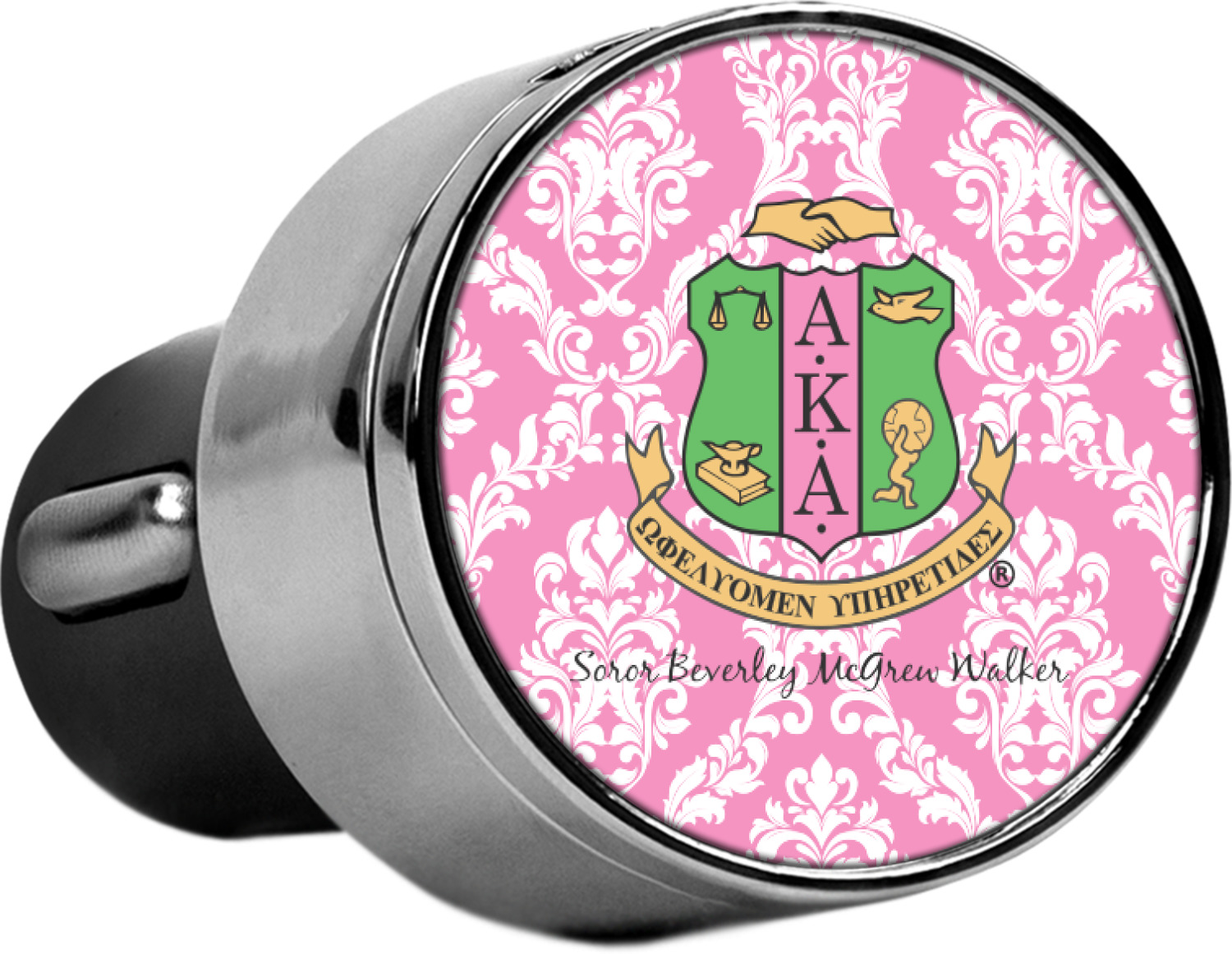 This car charger adapter converts your cars bland cigarette lighter into a decorative, personalized, and operational USB charging port. Made of solid, silver-plated metal, these chargers feature a flip-open lid that both displays your customized design and conceals two USB ports. The metal lid of the USB car charger adapter is 1.5" in diameter and seals due to a small, ingrained magnet on both the charger and its lid. The cigarette lighter insert, itself, is colored black.