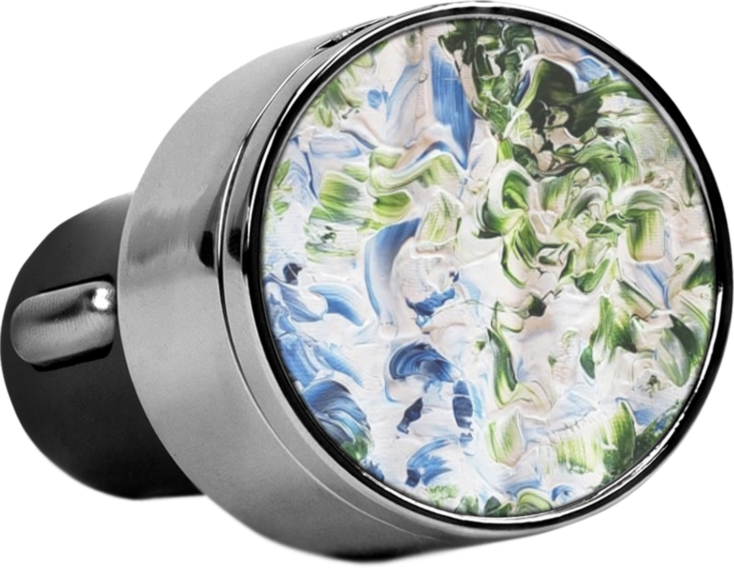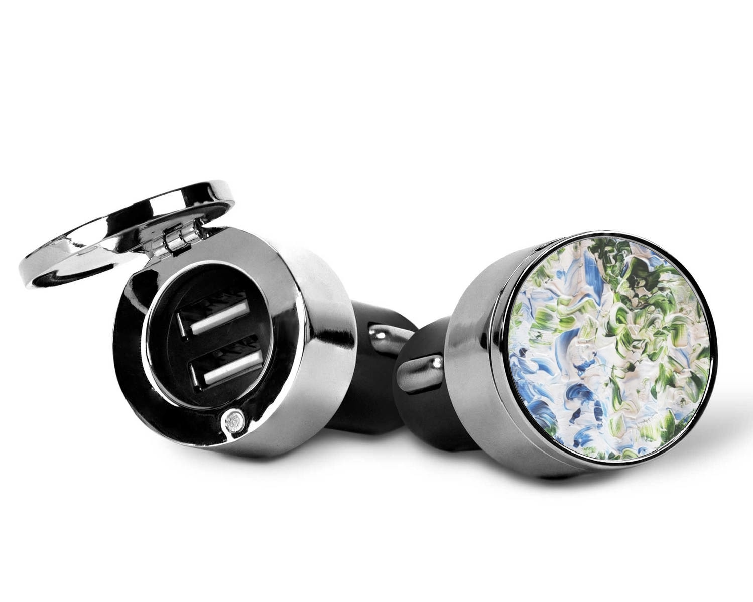 This car charger adapter converts your cars bland cigarette lighter into a decorative, personalized, and operational USB charging port. Made of solid, silver-plated metal, these chargers feature a flip-open lid that both displays your customized design and conceals two USB ports. The metal lid of the USB car charger adapter is 1.5" in diameter and seals due to a small, ingrained magnet on both the charger and its lid. The cigarette lighter insert, itself, is colored black.