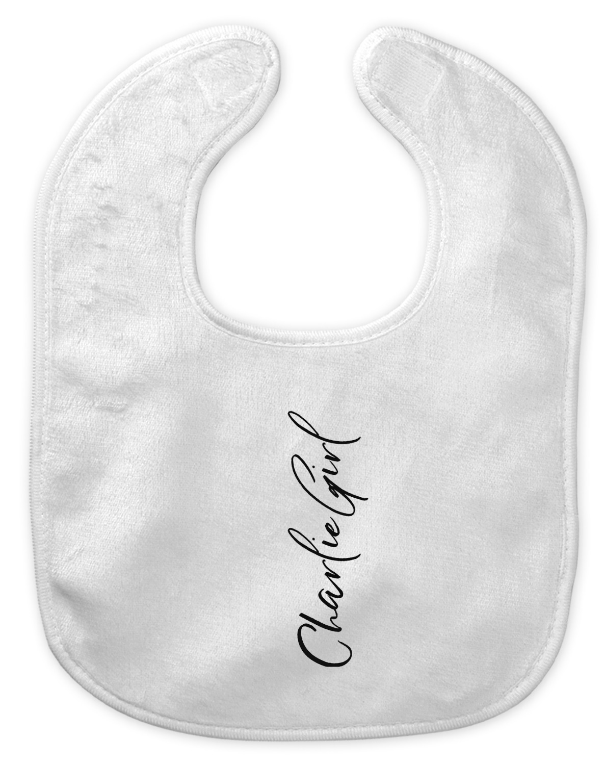 Made of soft polyester, each customizable bib hugs comfortably around the neck to catch every drip and drool. Each bib design is printed with baby-safe ink and finished with a secure stitch pattern and velcro clasp. We carry two customizable bib styles -Microfiber Velour and Jersey Knit.