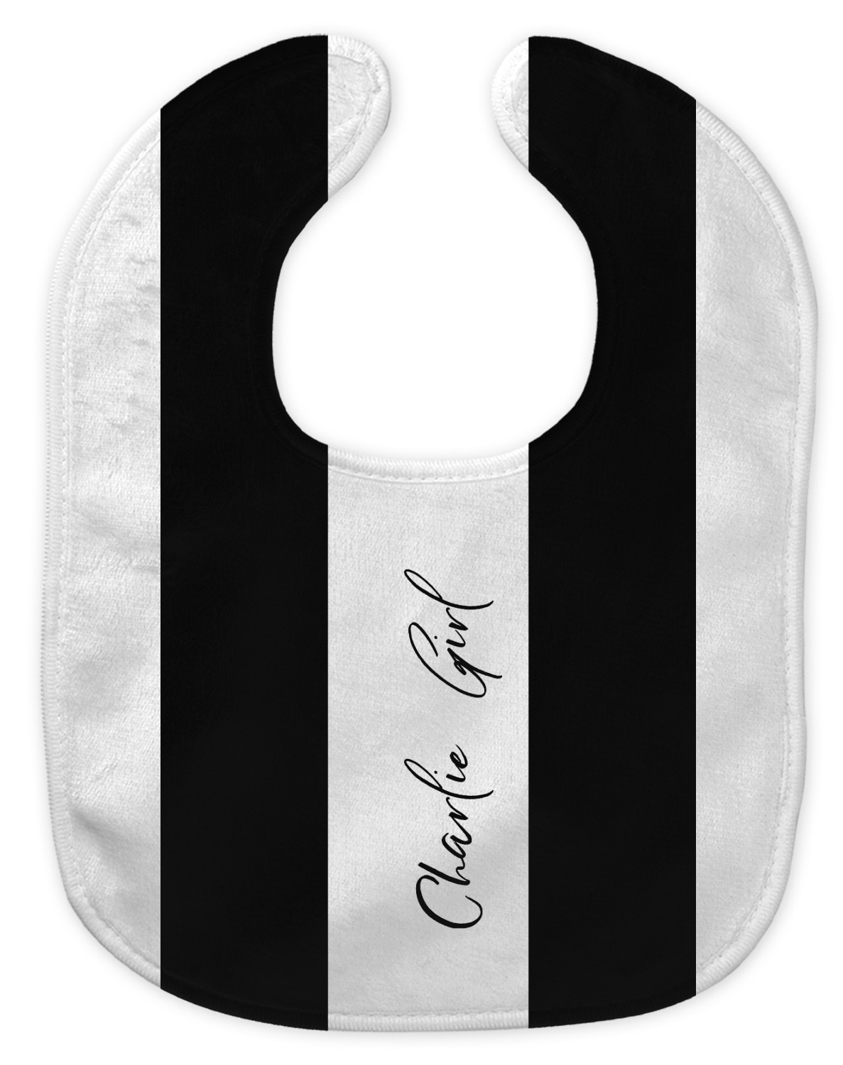 Made of soft polyester, each customizable bib hugs comfortably around the neck to catch every drip and drool. Each bib design is printed with baby-safe ink and finished with a secure stitch pattern and velcro clasp. We carry two customizable bib styles -Microfiber Velour and Jersey Knit.