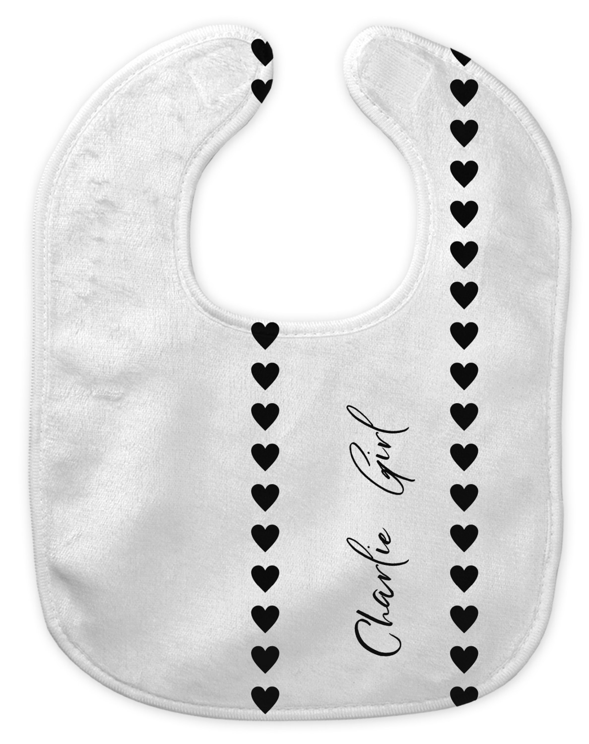 Made of soft polyester, each customizable bib hugs comfortably around the neck to catch every drip and drool. Each bib design is printed with baby-safe ink and finished with a secure stitch pattern and velcro clasp. We carry two customizable bib styles -Microfiber Velour and Jersey Knit.
