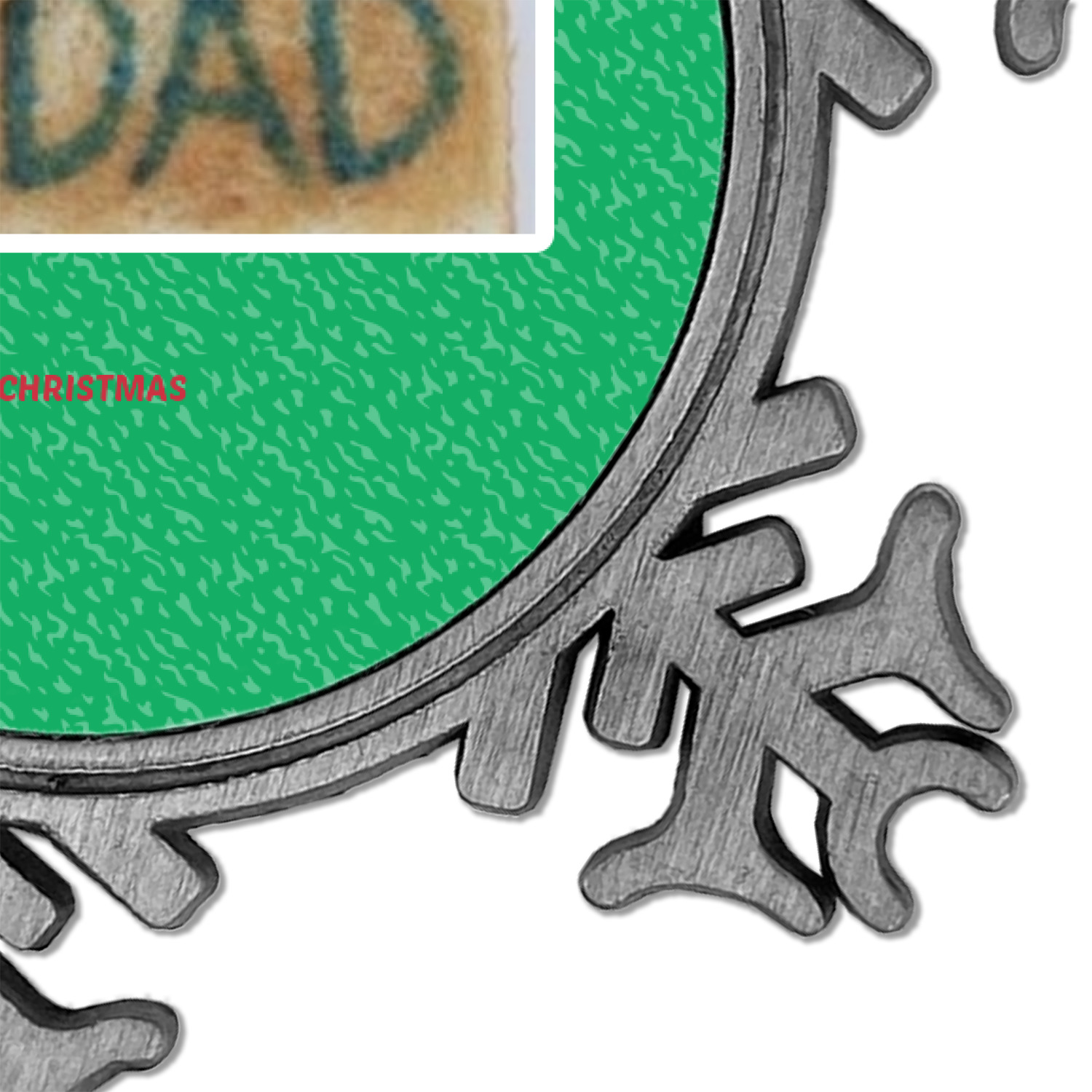 The snowflake shape ornament is an everlasting pewter material with a circular center to display your photo or design, giving it a unique vintage ornament look. Our personalized Christmas ornament comes in a small gift box for keepsake sure to preserve your picture ornament until the next holiday season. The snowflake shape is approximately 3 x 3 with a small silver accent string perfect for hanging. We print your photo or design in the center of the ornament with a size that is roughly 1.75 in diameter.