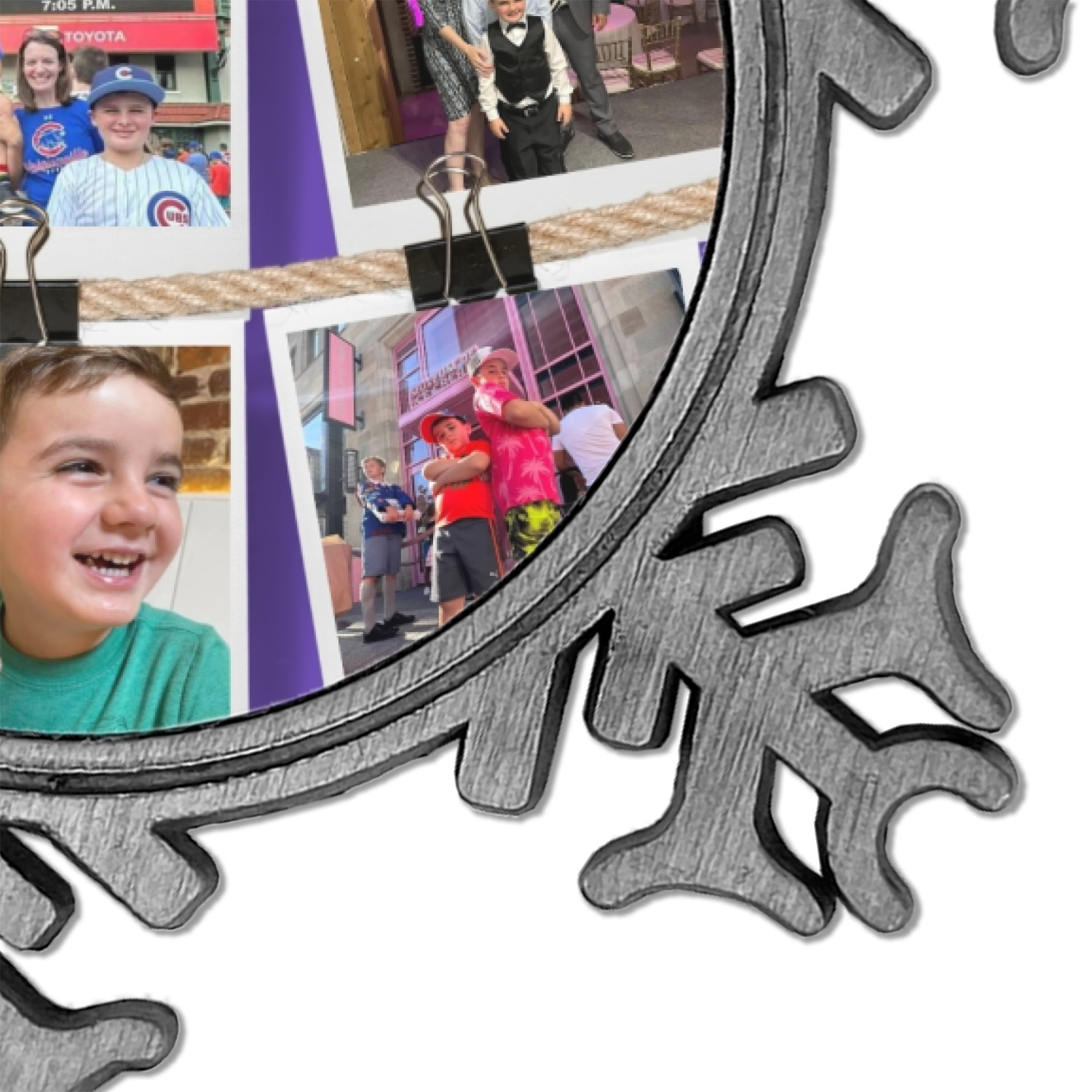 The snowflake shape ornament is an everlasting pewter material with a circular center to display your photo or design, giving it a unique vintage ornament look. Our personalized Christmas ornament comes in a small gift box for keepsake sure to preserve your picture ornament until the next holiday season. The snowflake shape is approximately 3 x 3 with a small silver accent string perfect for hanging. We print your photo or design in the center of the ornament with a size that is roughly 1.75 in diameter.