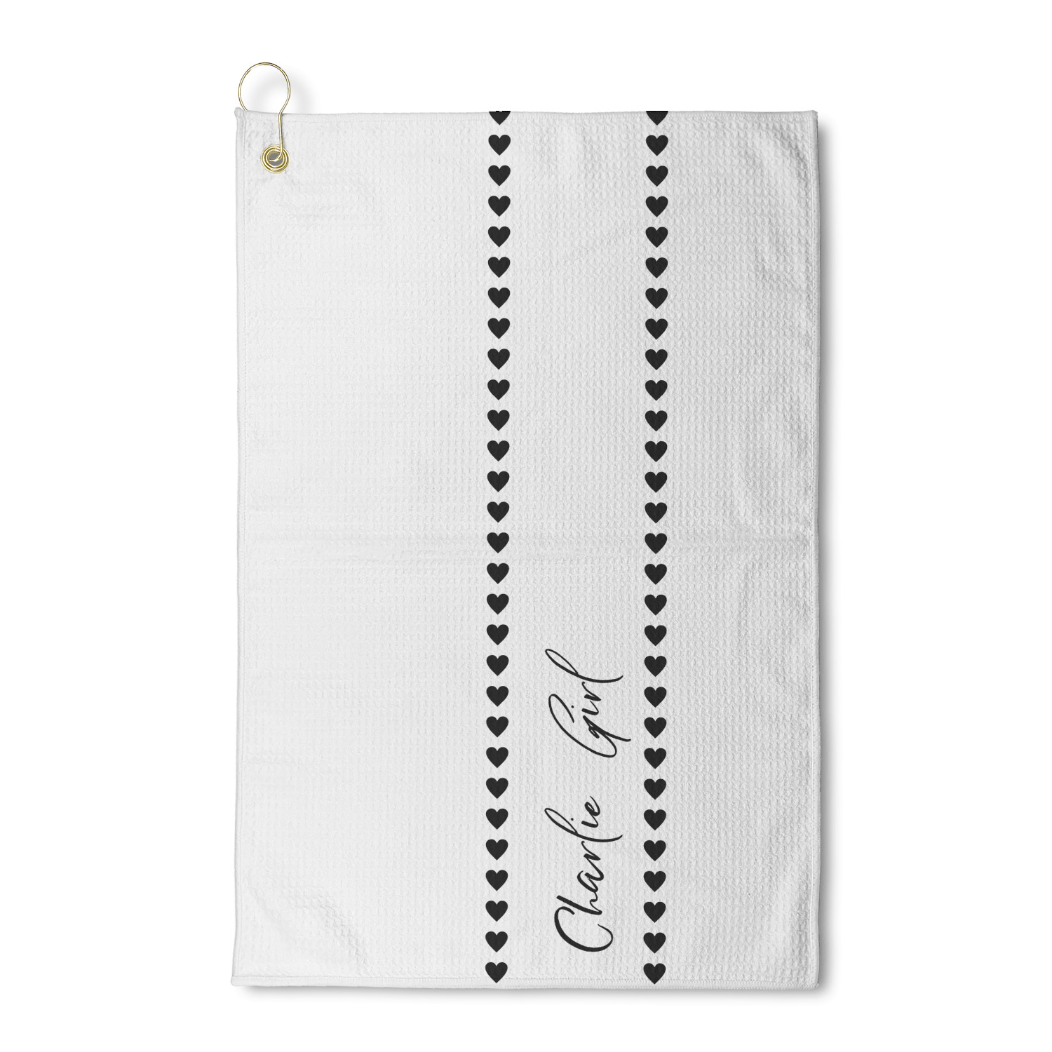 Personalize your design for your towel in our design studio then we will custom print and make it for you. The heavy duty brass grommet and hook are perfect for hanging anywhere you need it to. The waffle weave material is a durable microfiber material that will absorb up to 7 times its weight.