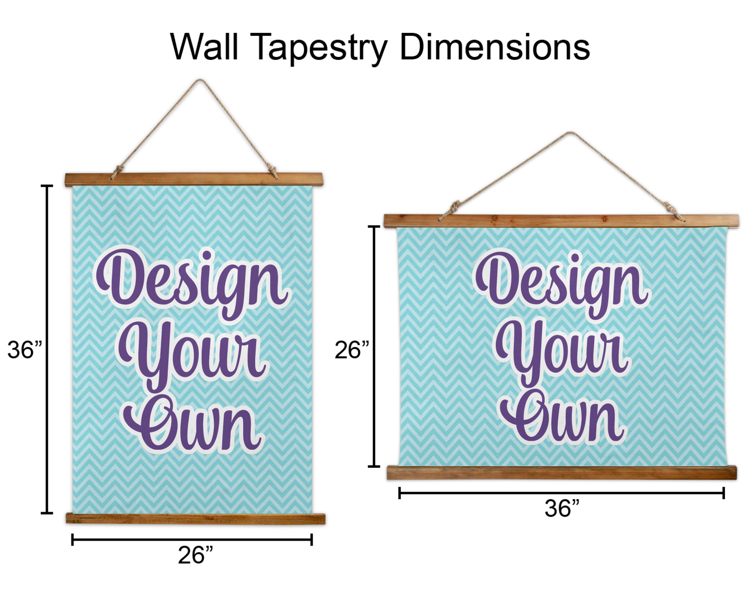 Made in two different orientations - portrait or landscape - both are 26" x 36". Your design is printed on a high quality polyester fabric with hemmed edges. The wood on the top and bottom of the tapestry is 1.25" tall and 0.25" thick and there are two pieces on top and bottom which sandwich the fabric.