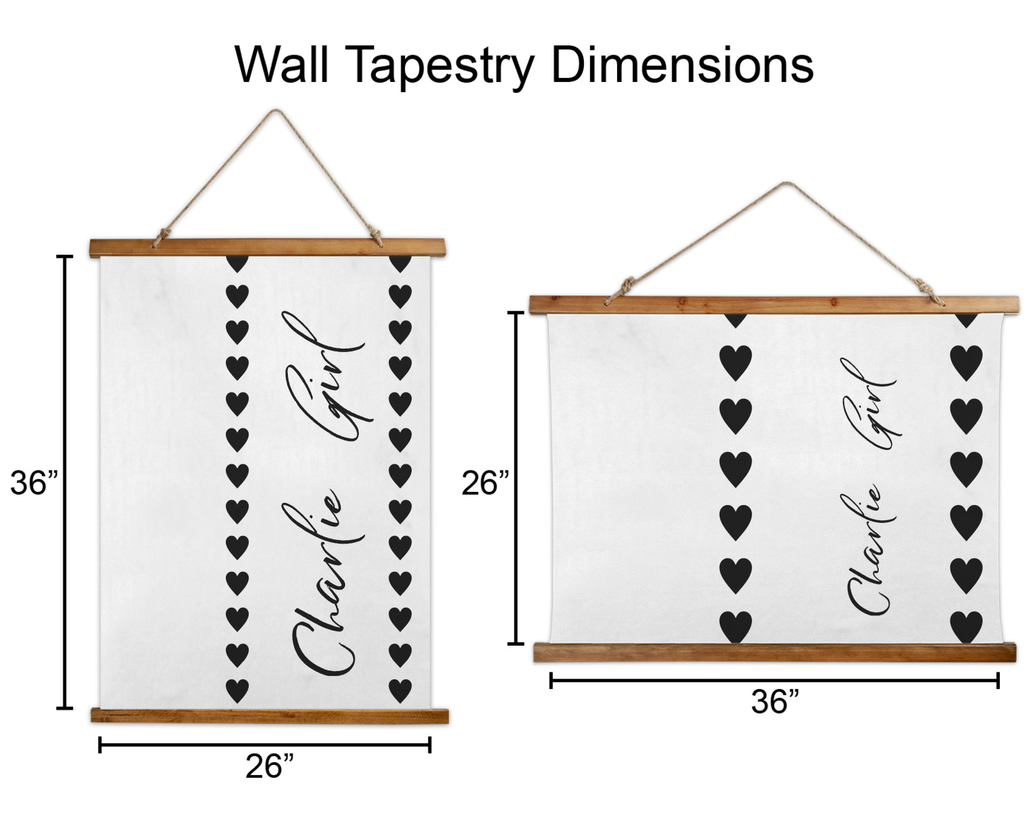 Made in two different orientations - portrait or landscape - both are 26" x 36". Your design is printed on a high quality polyester fabric with hemmed edges. The wood on the top and bottom of the tapestry is 1.25" tall and 0.25" thick and there are two pieces on top and bottom which sandwich the fabric.