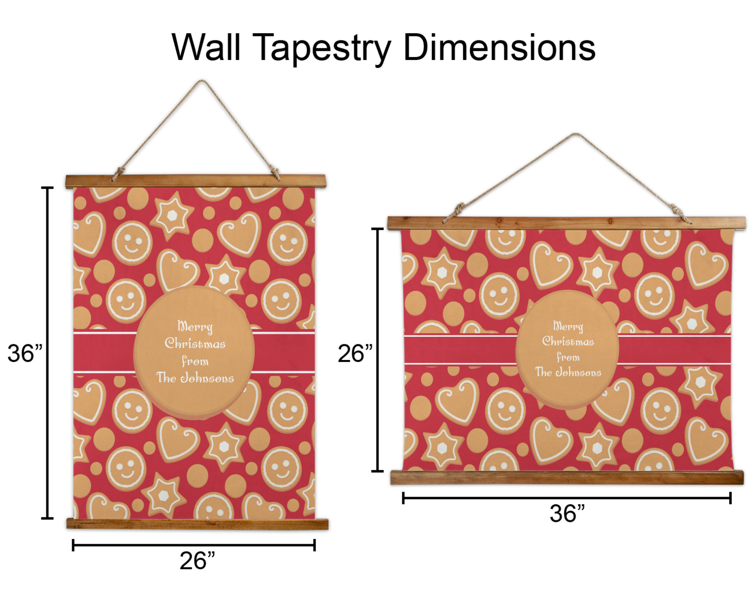 Made in two different orientations - portrait or landscape - both are 26" x 36". Your design is printed on a high quality polyester fabric with hemmed edges. The wood on the top and bottom of the tapestry is 1.25" tall and 0.25" thick and there are two pieces on top and bottom which sandwich the fabric.