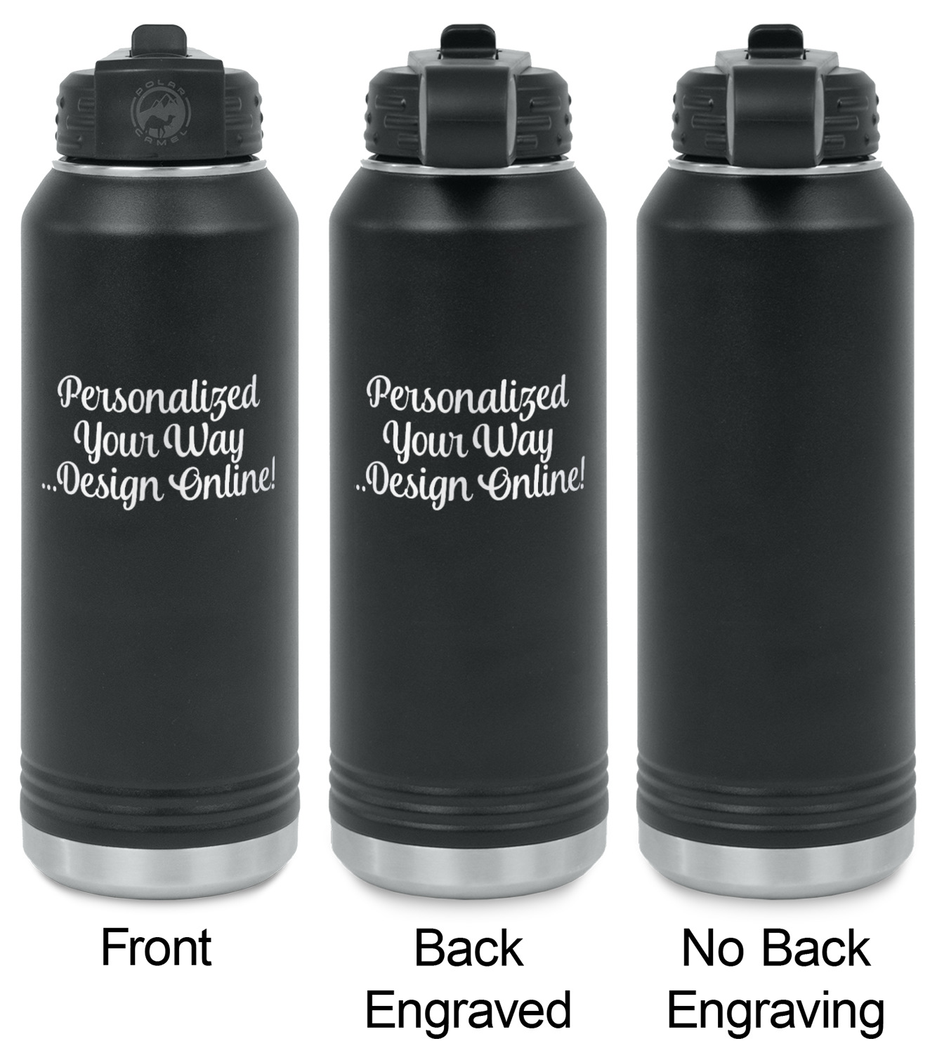 Your design is laser engraved on the water bottles. The engraving removes the black powder coating in the designed area to expose the silver stainless steel underneath.