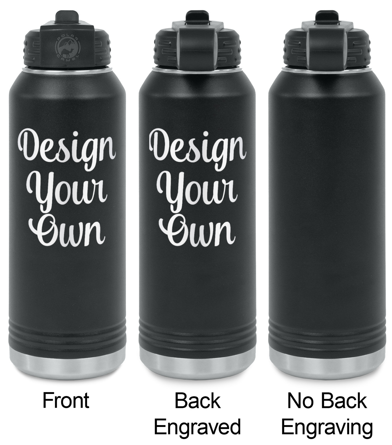 Your design is laser engraved on the water bottles. The engraving removes the black powder coating in the designed area to expose the silver stainless steel underneath.