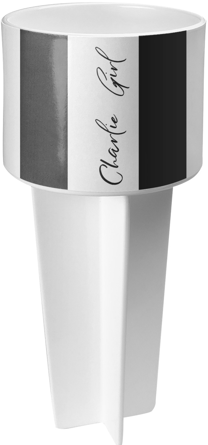 This cup holder has a large stake at its bottom that anchors it to the sand or ground below, while the cup holder rests above the stake. The entire drink holder is made of durable plastic and displays your customization around the cup holder portion. We sell these personalized beach spikers in two different colors: black and white.
