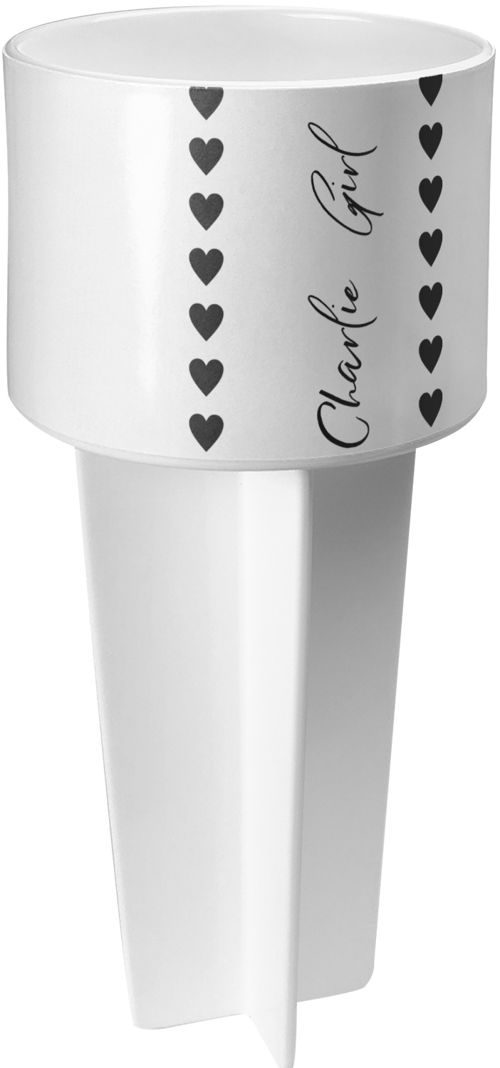 This cup holder has a large stake at its bottom that anchors it to the sand or ground below, while the cup holder rests above the stake. The entire drink holder is made of durable plastic and displays your customization around the cup holder portion. We sell these personalized beach spikers in two different colors: black and white.