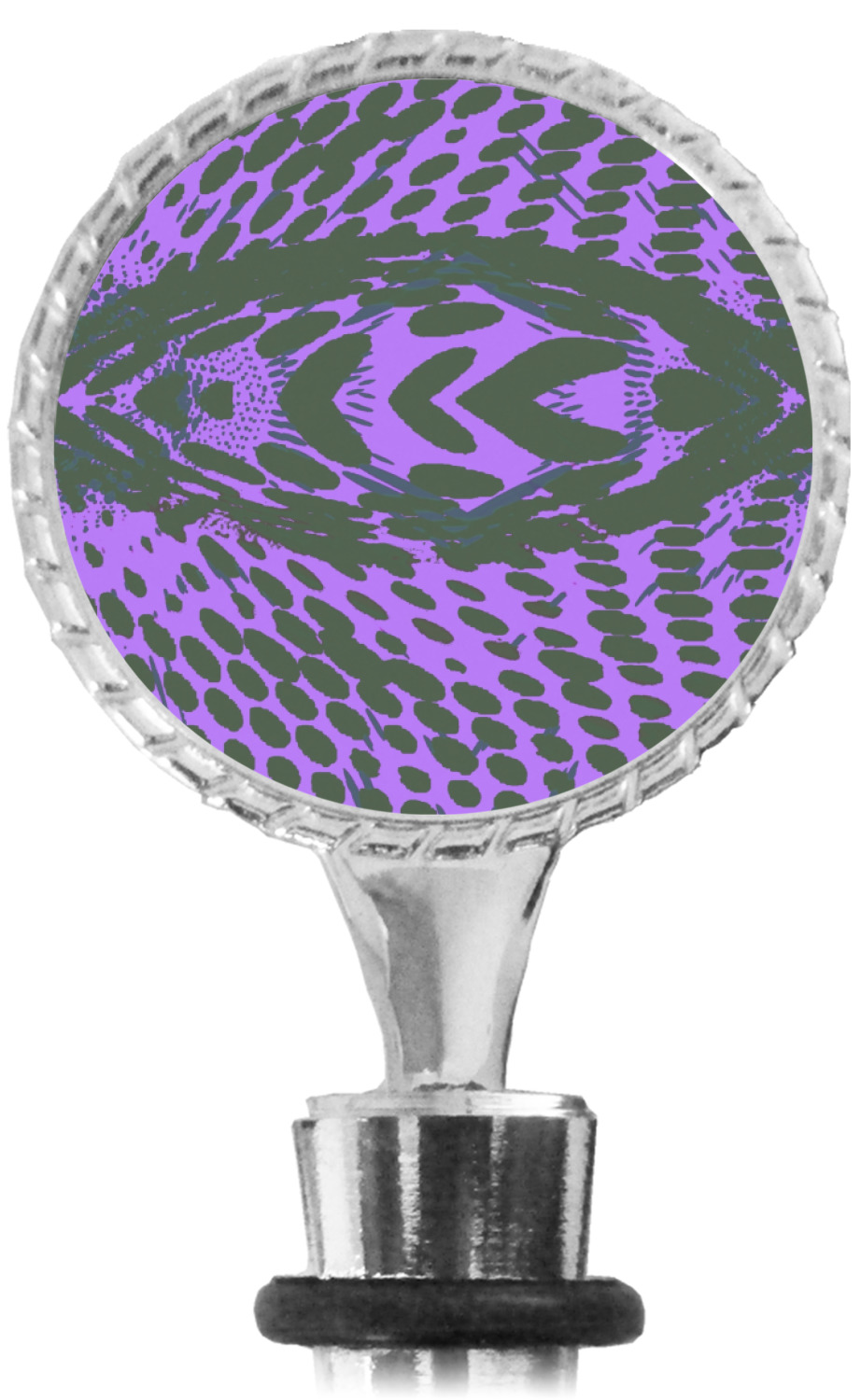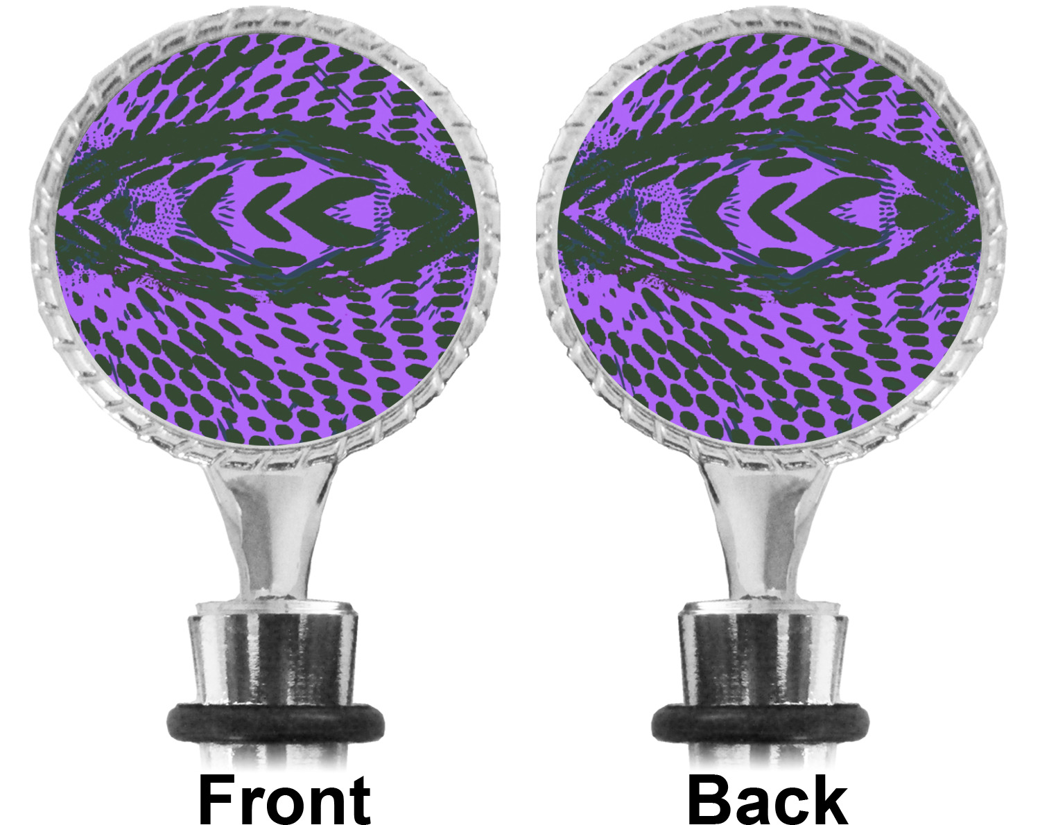 The top part of your bottle stopper is comprised of a zinc ring that displays your customization(s) in its middle, on both sides. The ring is heavy duty, with a bright chrome finish. The body of the wine stoppers have two silicone rings to provide an airtight seal. These wine bottle stoppers measure at 1.625" L x 0.8125" W x 4.625" H; your custom wine stopper is meant to fit into most standard-sized wine bottles.