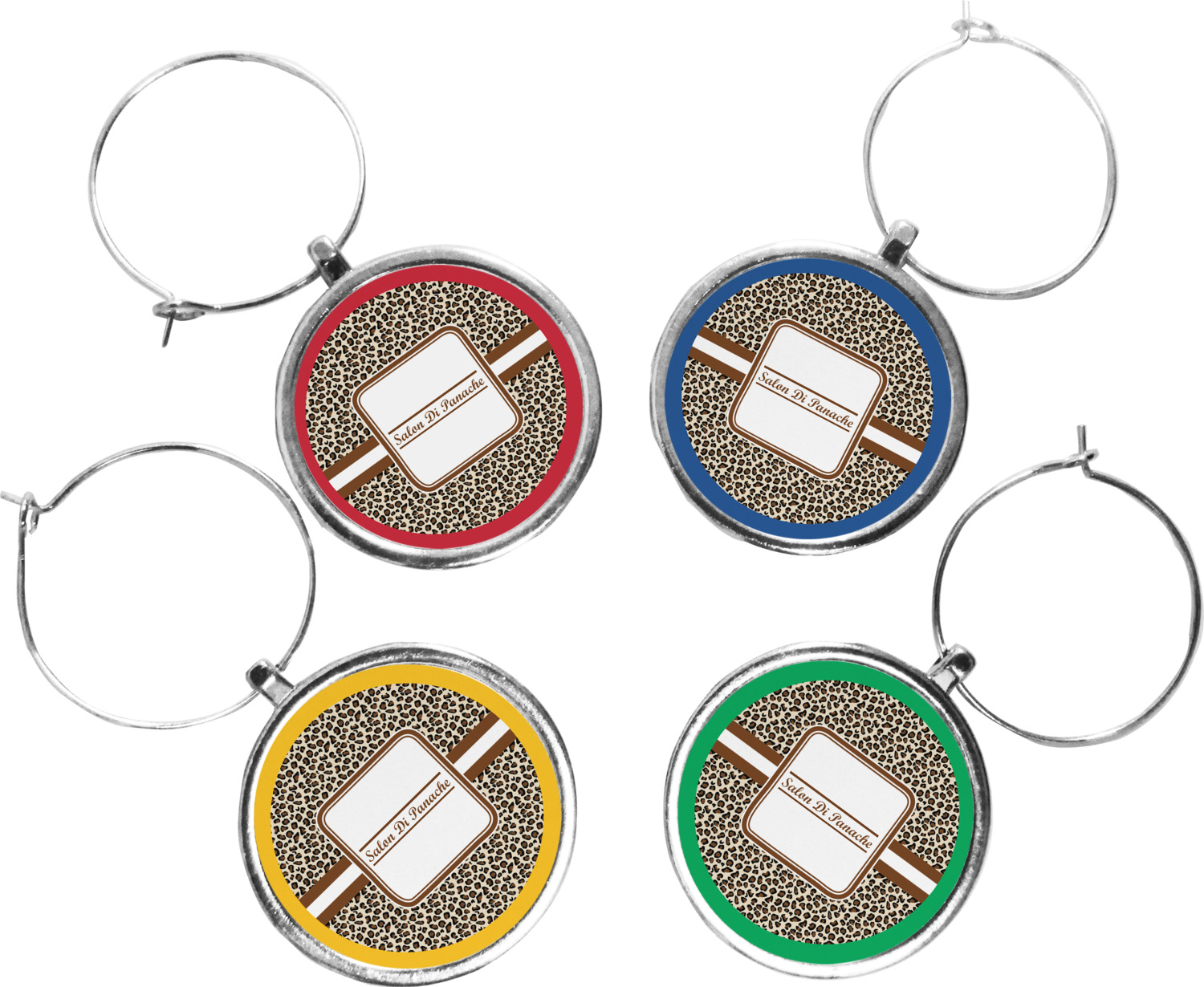 Your wine glass markers are comprised of a circular zinc plate with a 1.25 inch diameter. The zinc plate hangs from a zinc loop, which can be easily secured and removed from the stem of a wine glass. Your customized design is printed onto a 1 inch diameter insert, and then placed into the wine glass charm itself. Though sold in a set of four, you can personalize each charm individually and change the colors of the ring around your design, depending on your needs.