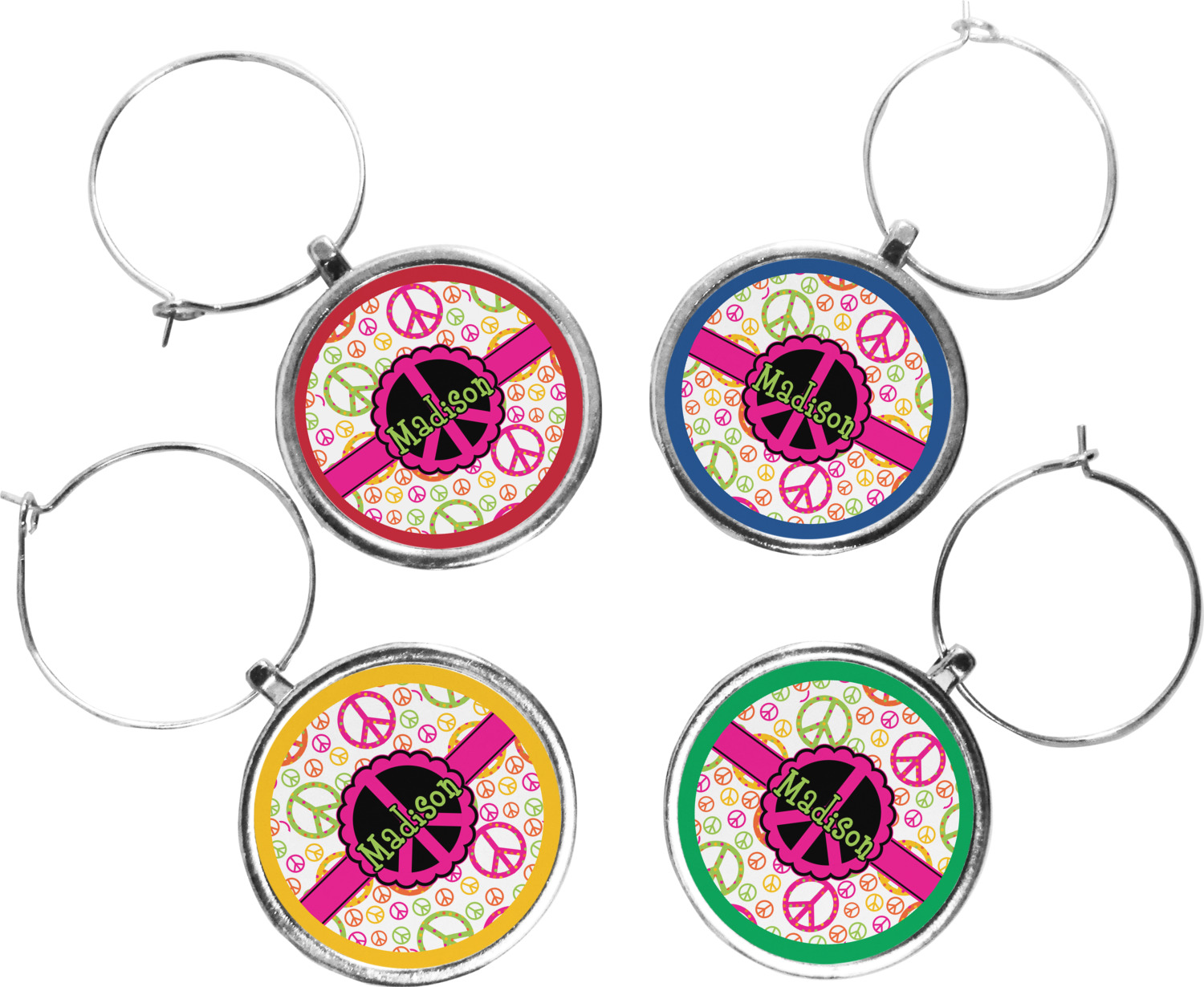 Your wine glass markers are comprised of a circular zinc plate with a 1.25 inch diameter. The zinc plate hangs from a zinc loop, which can be easily secured and removed from the stem of a wine glass. Your customized design is printed onto a 1 inch diameter insert, and then placed into the wine glass charm itself. Though sold in a set of four, you can personalize each charm individually and change the colors of the ring around your design, depending on your needs.
